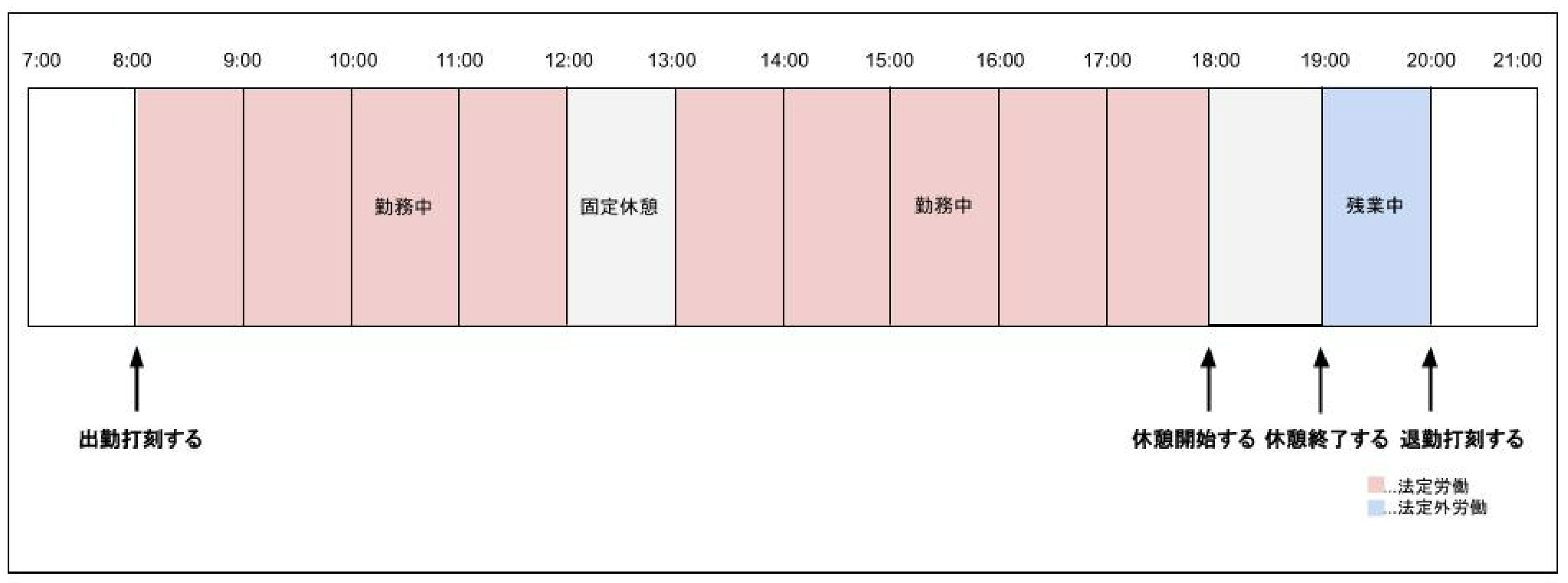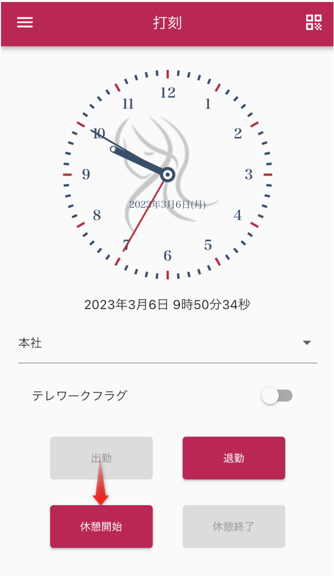 固定休憩が設定されている場合は休憩開始ボタンを押さなくても、休憩時間が計算されます。