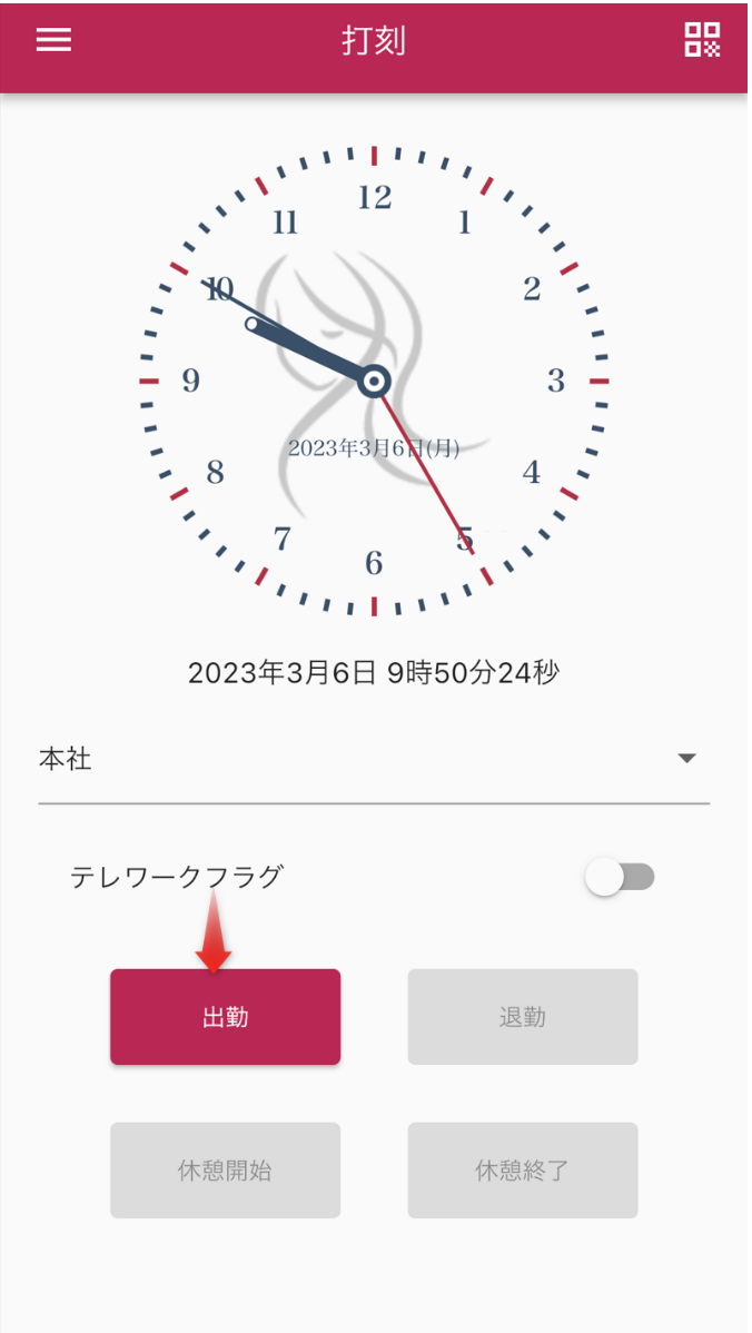現在の打刻状態に合わせて押せるボタンが赤色で表示されます。