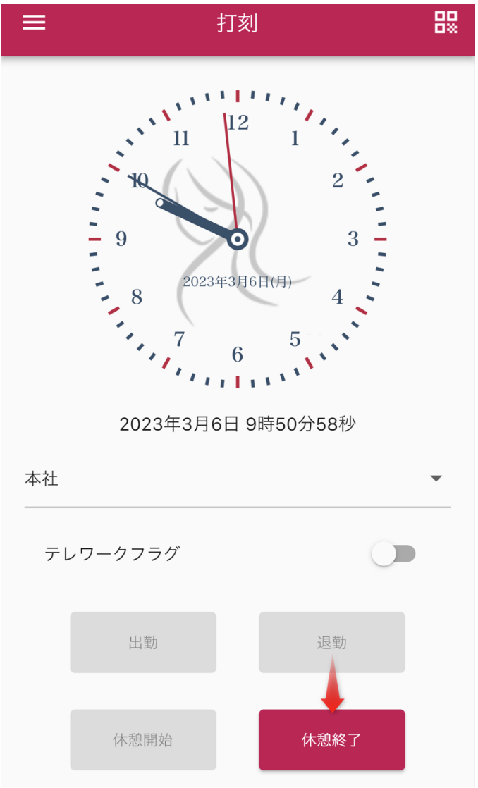 休憩を終了し、仕事に戻る時は、休憩終了ボタンを押してください。