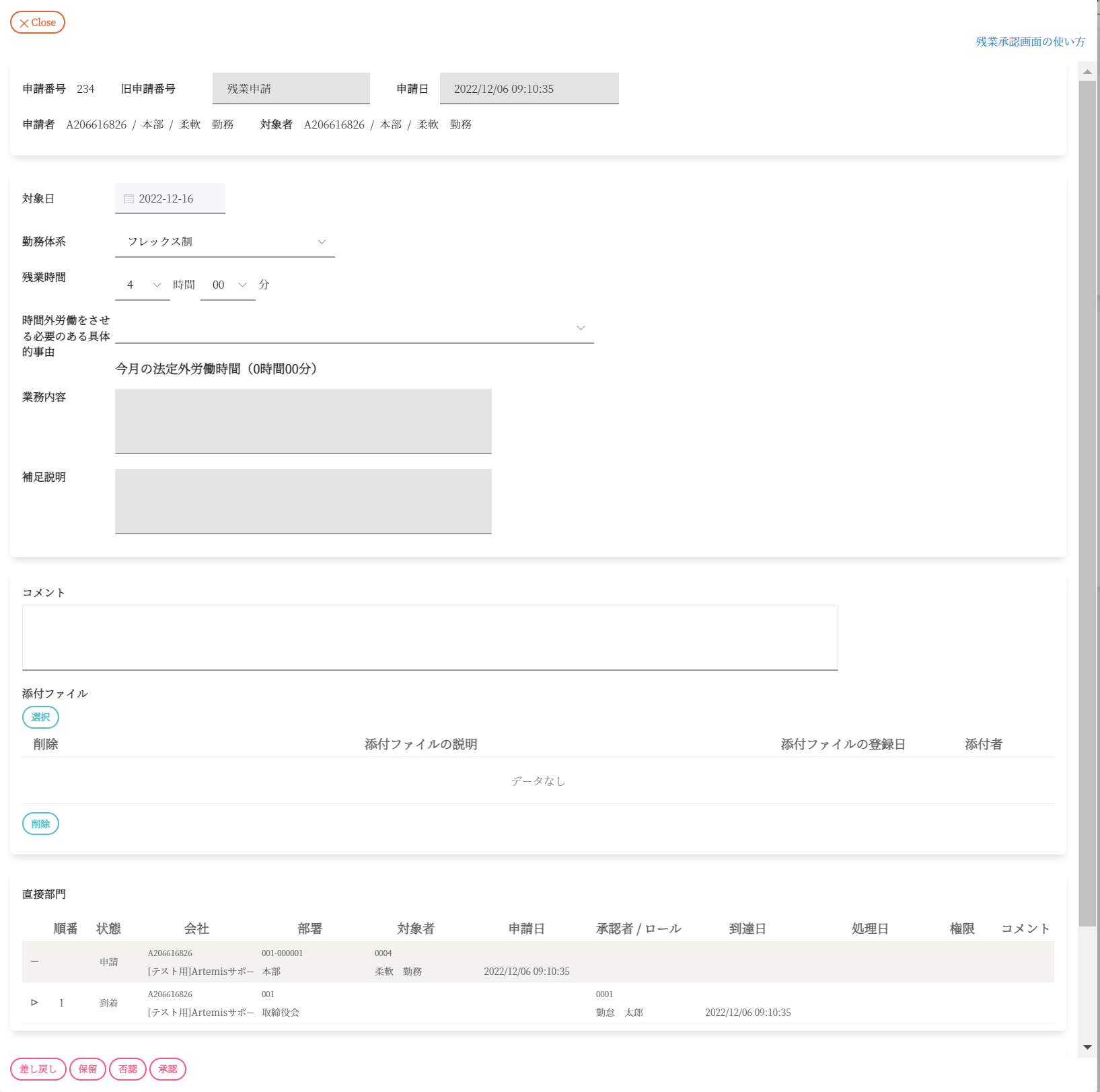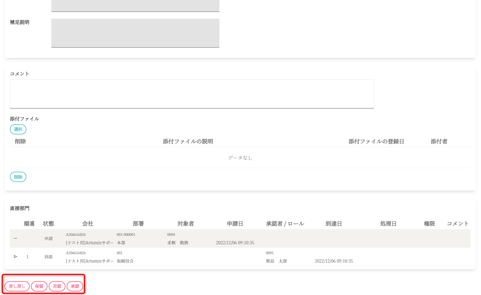 左下に「差し戻し/保留/否認/承認」ボタンが表示が表示されています。