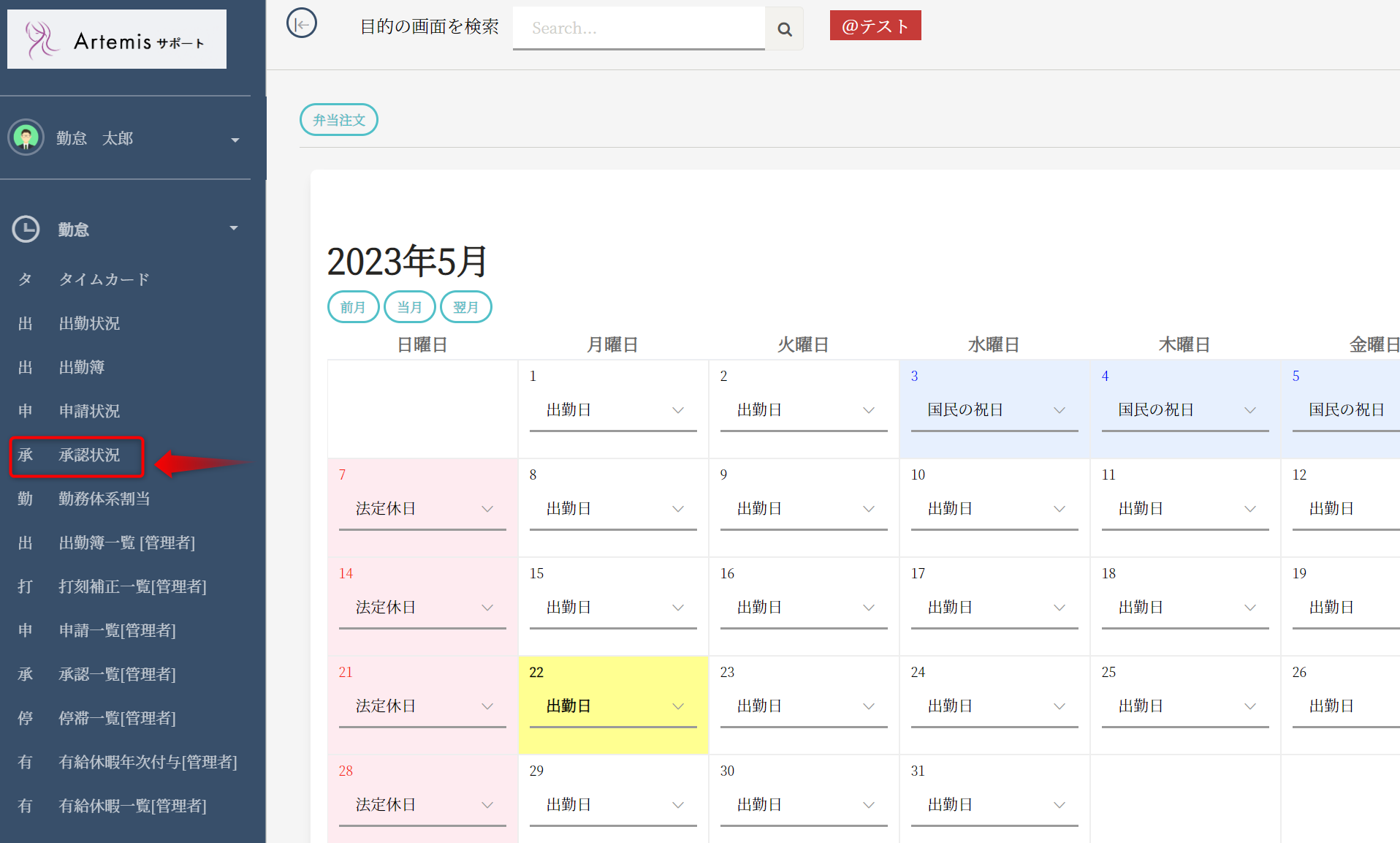 メニュー欄(左側)の勤怠>承認状況ボタンを押してください。