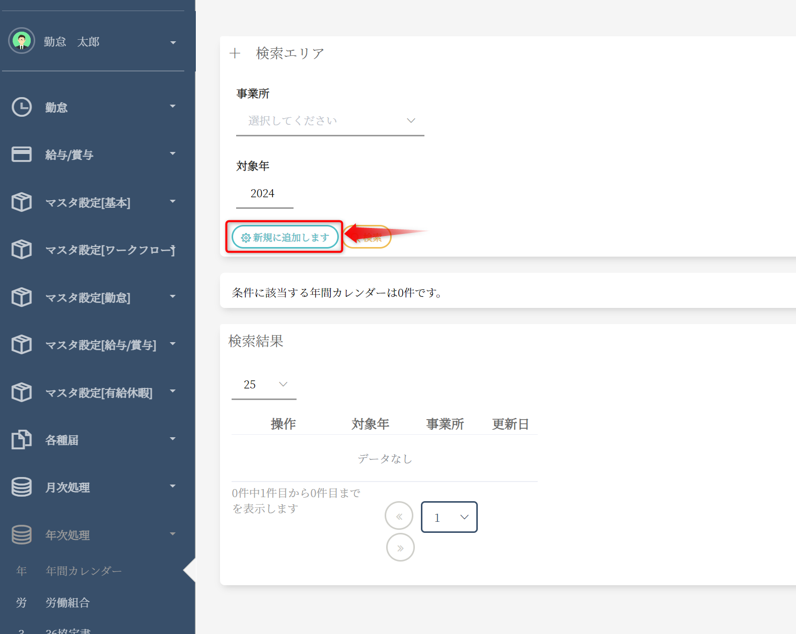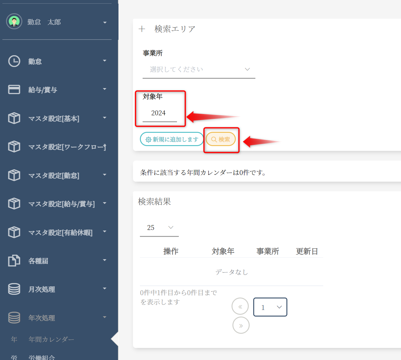 対象年に作成したい年を入力し、検索ボタンをクリックしてください。