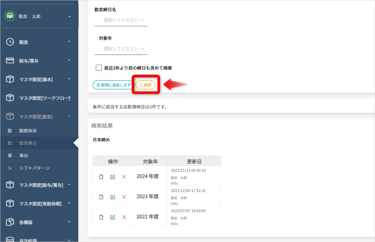 検索ボタンを選択すると登録されている全ての締日が表示されます。