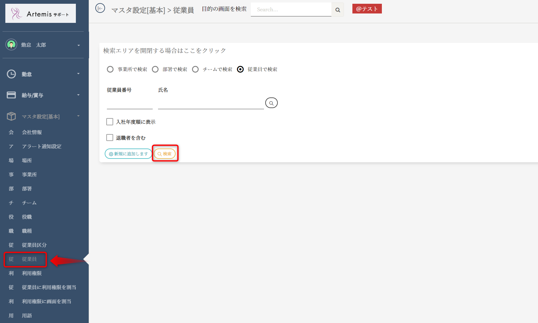 メニュー欄(左側)のマスタ設定(基本)>従業員ボタンを押してください。