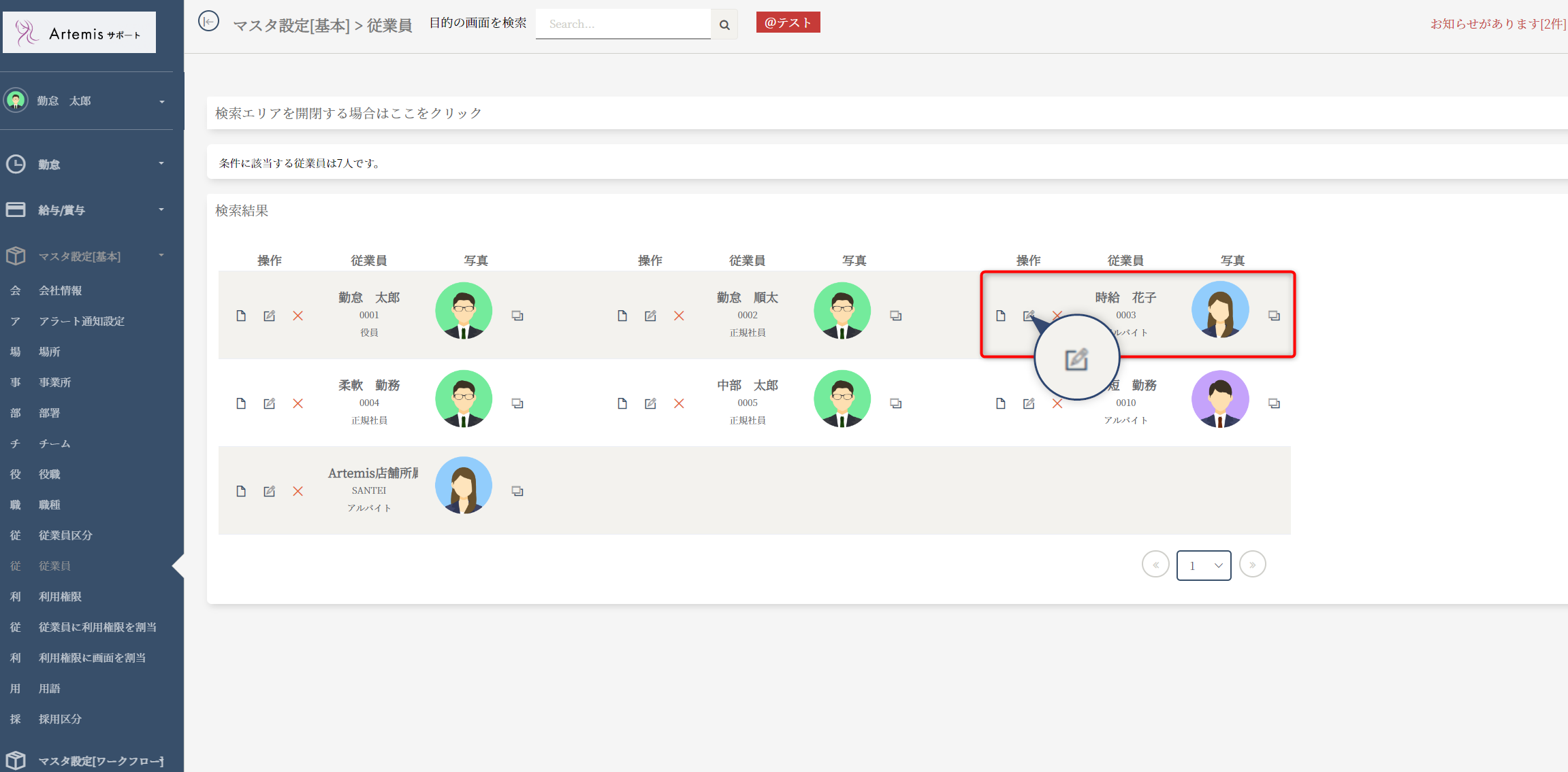 「検索」ボタンを押すと従業員の一覧が表示されます。