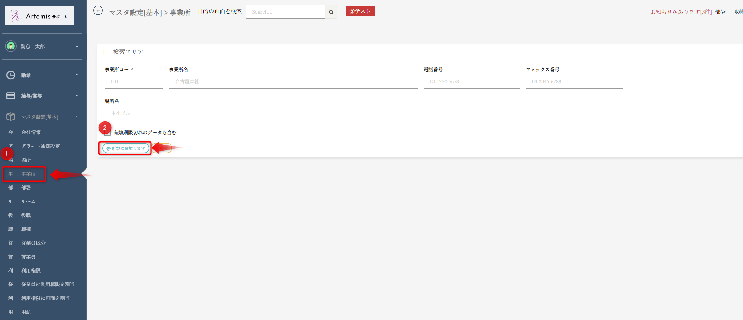 メニュー欄(左側)のマスタ設定(基本)>事業所を選択してください。