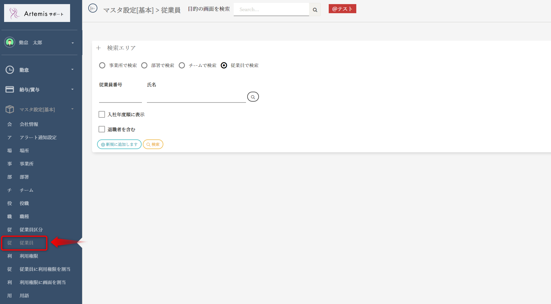 メニュー欄(左側)のマスタ設定(基本)>従業員を選択してください。