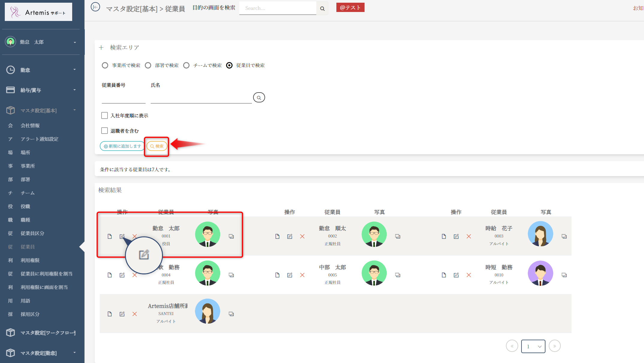 従業員の一覧が出てきますので、該当の従業員の鉛筆ボタンを押してください。