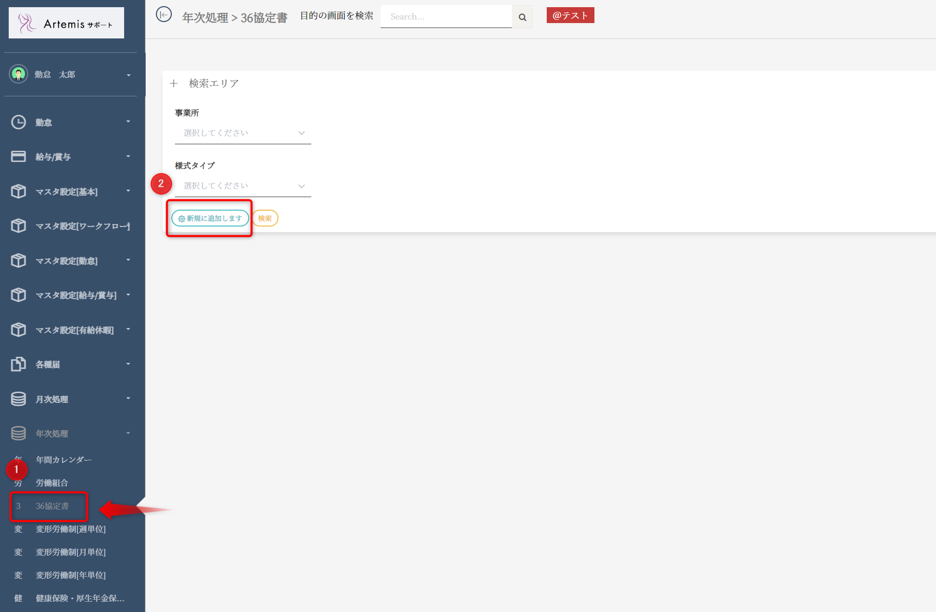 メニュー欄(左側)の年次処理>36協定書を選択してください。