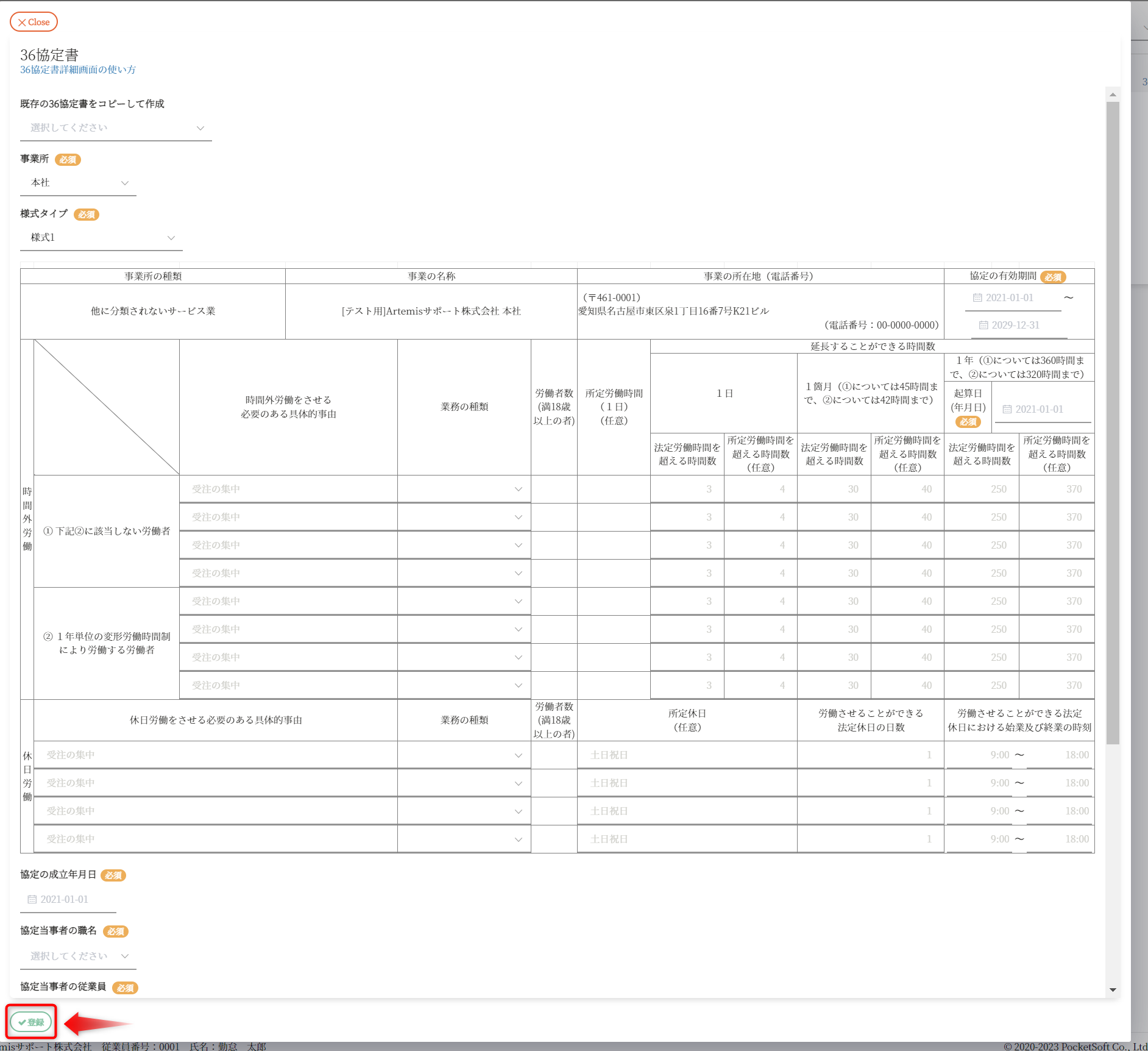 詳しい36協定書の入力については「36協定書詳細画面の使い方」で記載しております。