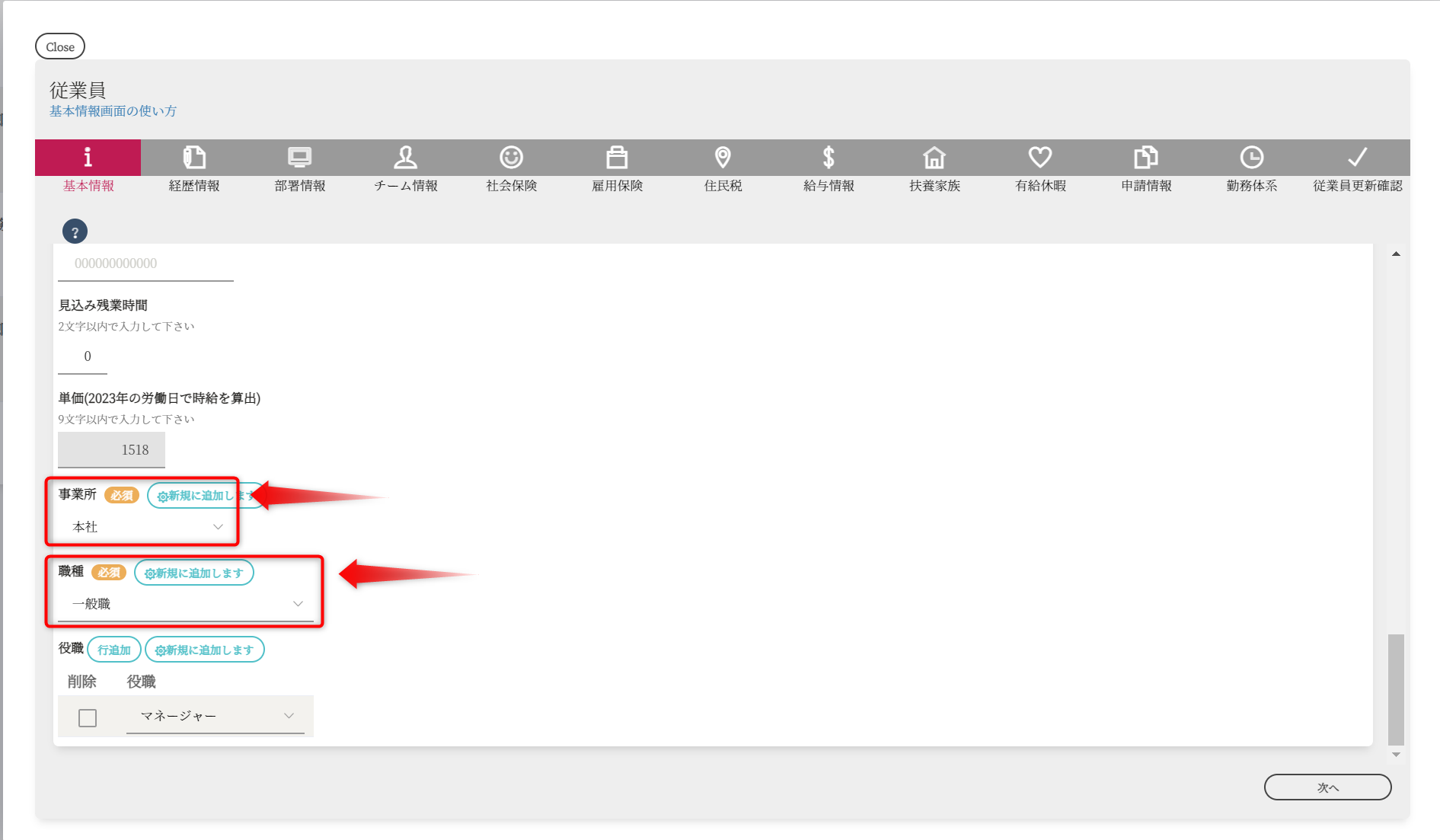 詳しい従業員(基本情報)画面については「基本情報画面の使い方」で記載しております。