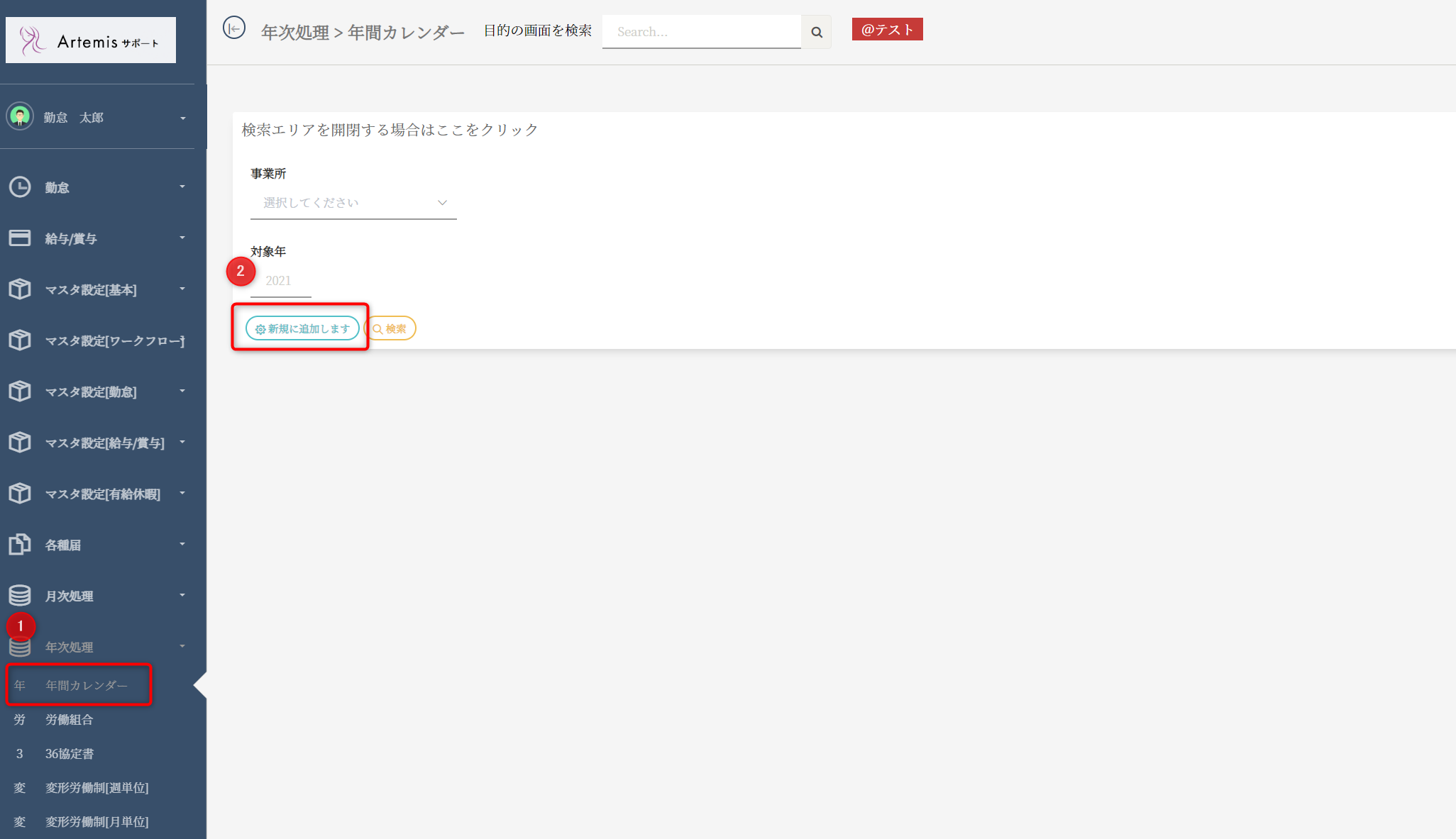 メニュー欄(左側)の年次処理>年間カレンダーを選択してください。