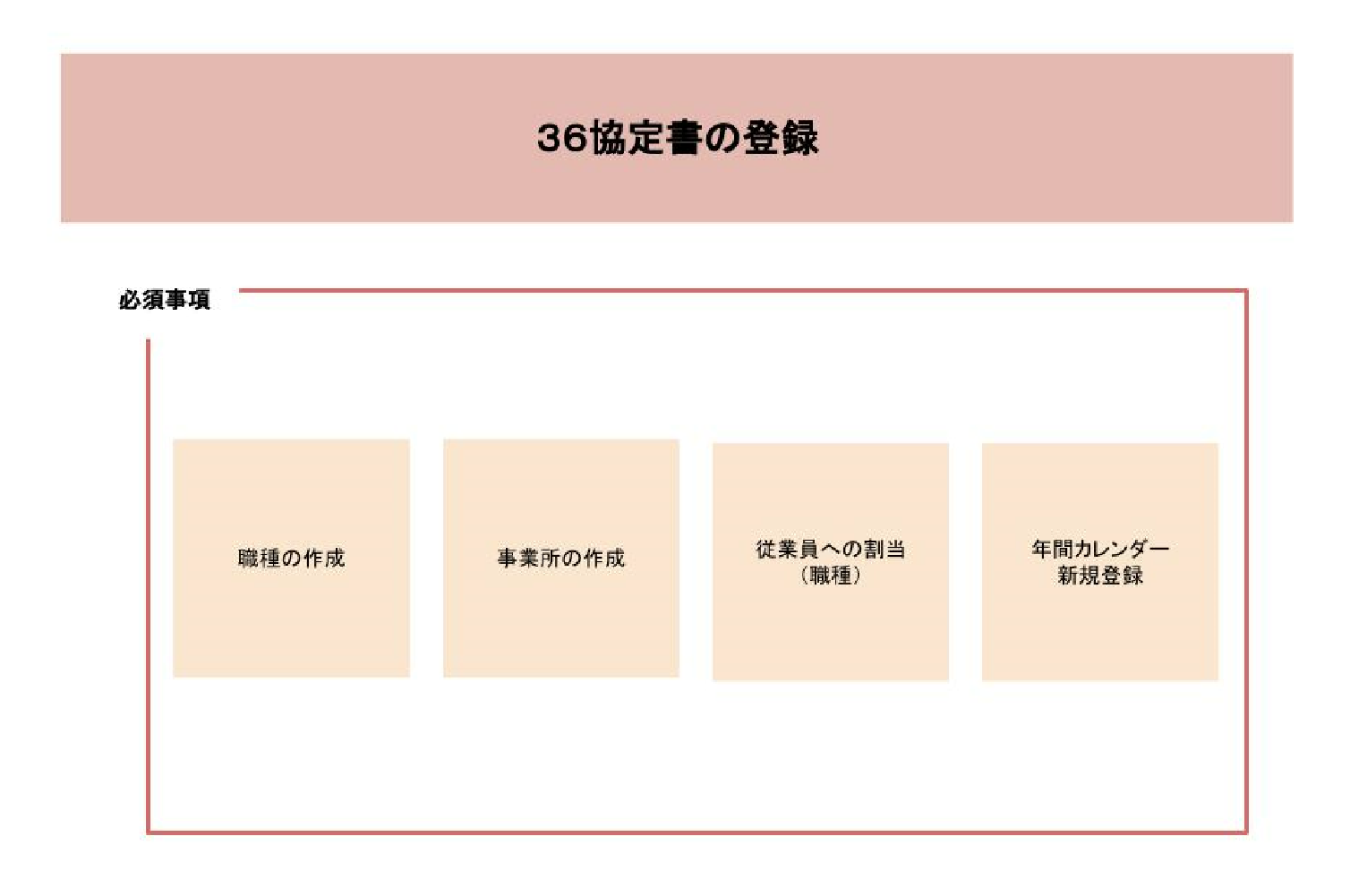 管理職が36協定書を登録するためには、「事業所の作成」「年間カレンダーの新規登録」「役職の作成」「従業員への割当(役職)」です。