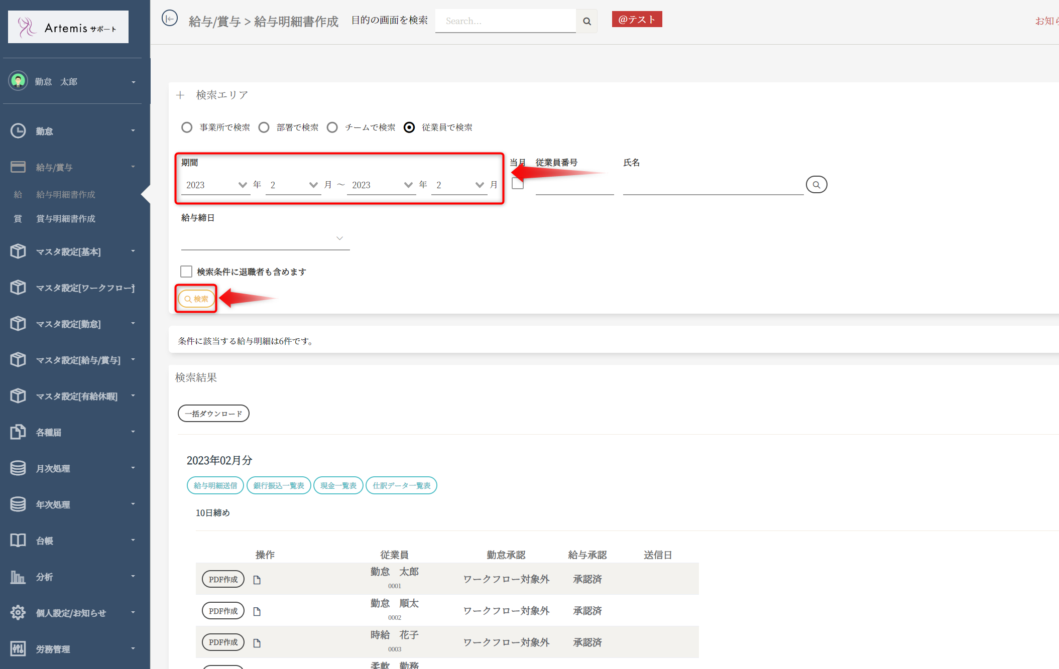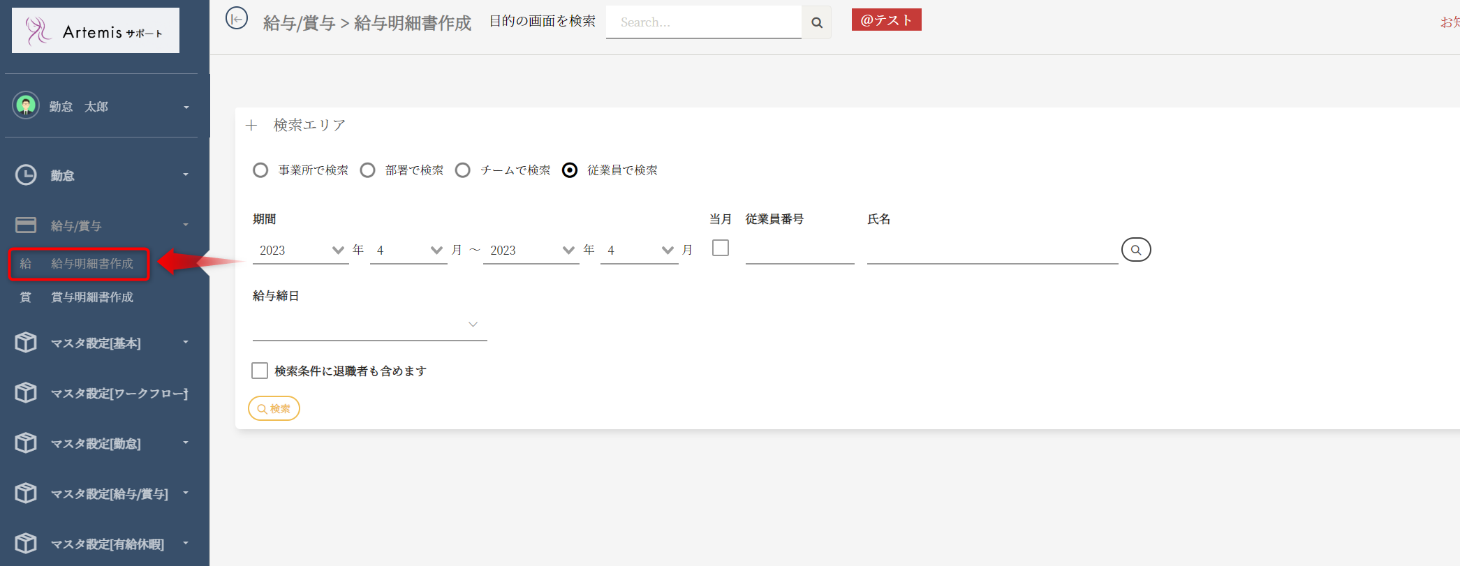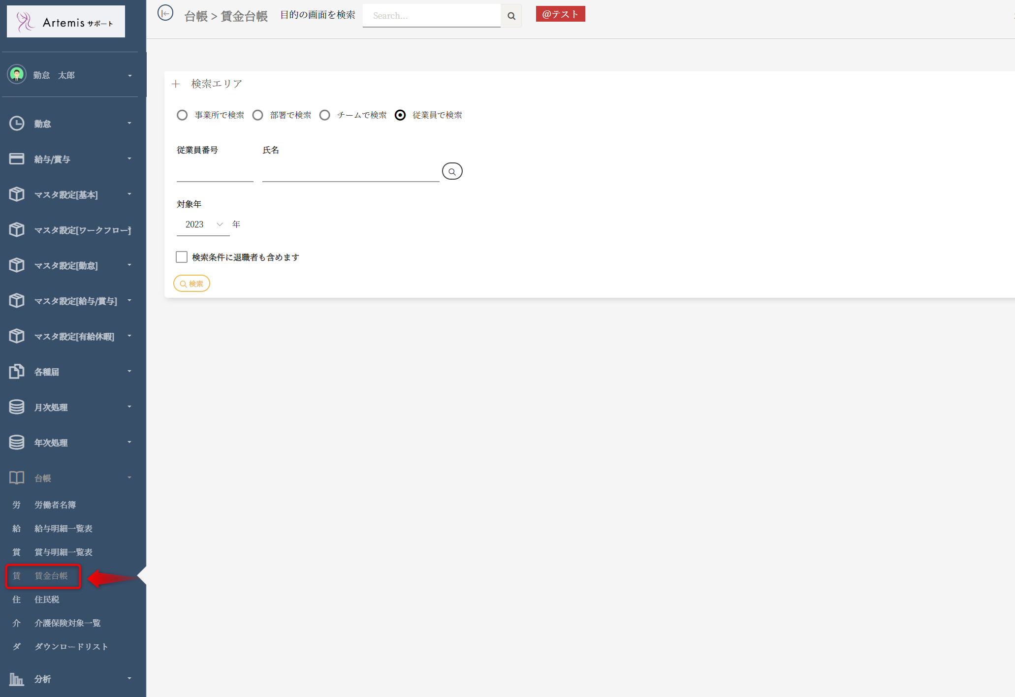また、退職者も含めたい場合は「検索条件に対象者も含めます」のチェックを付けて「検索」ボタンを押してください。
