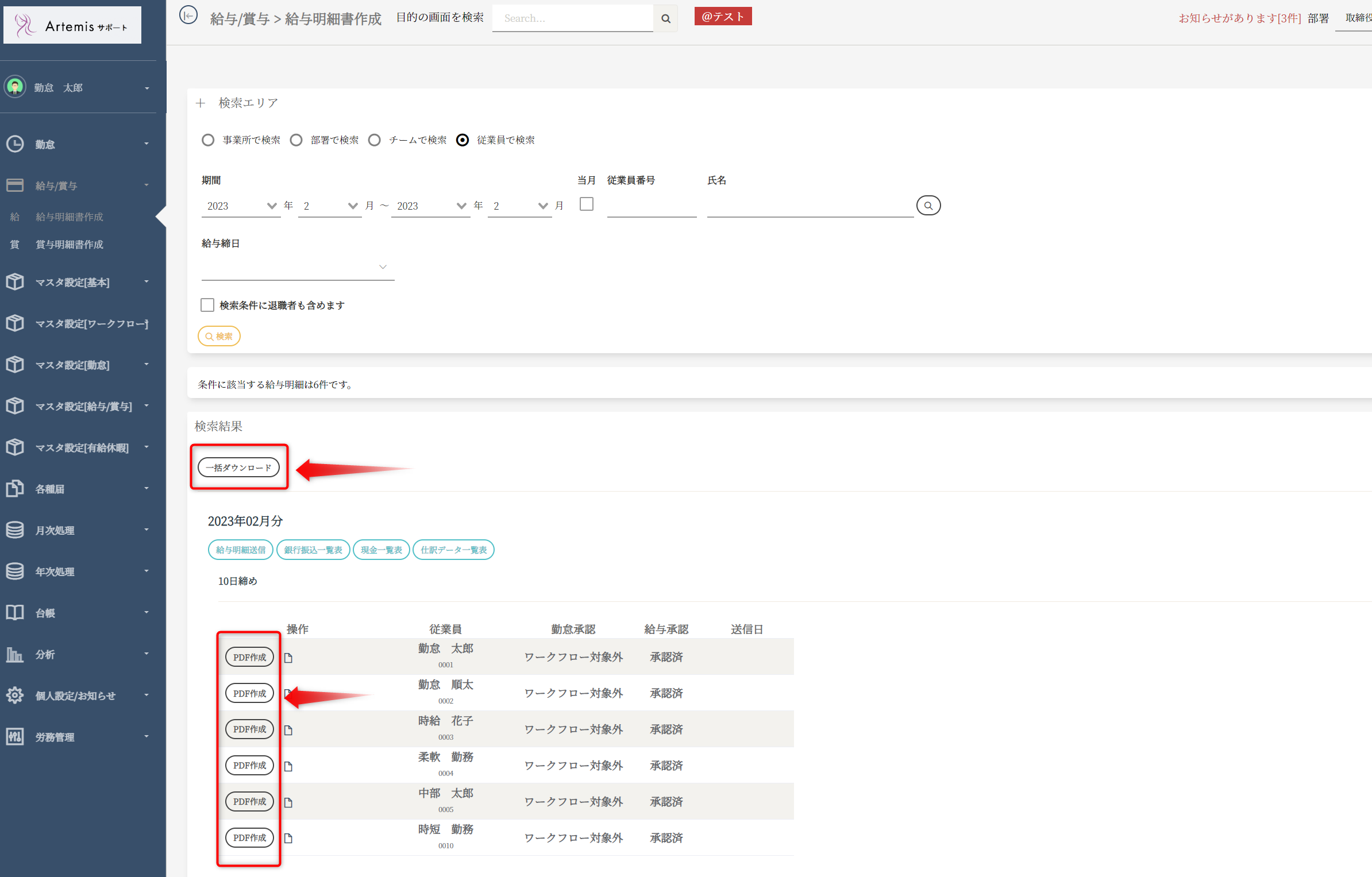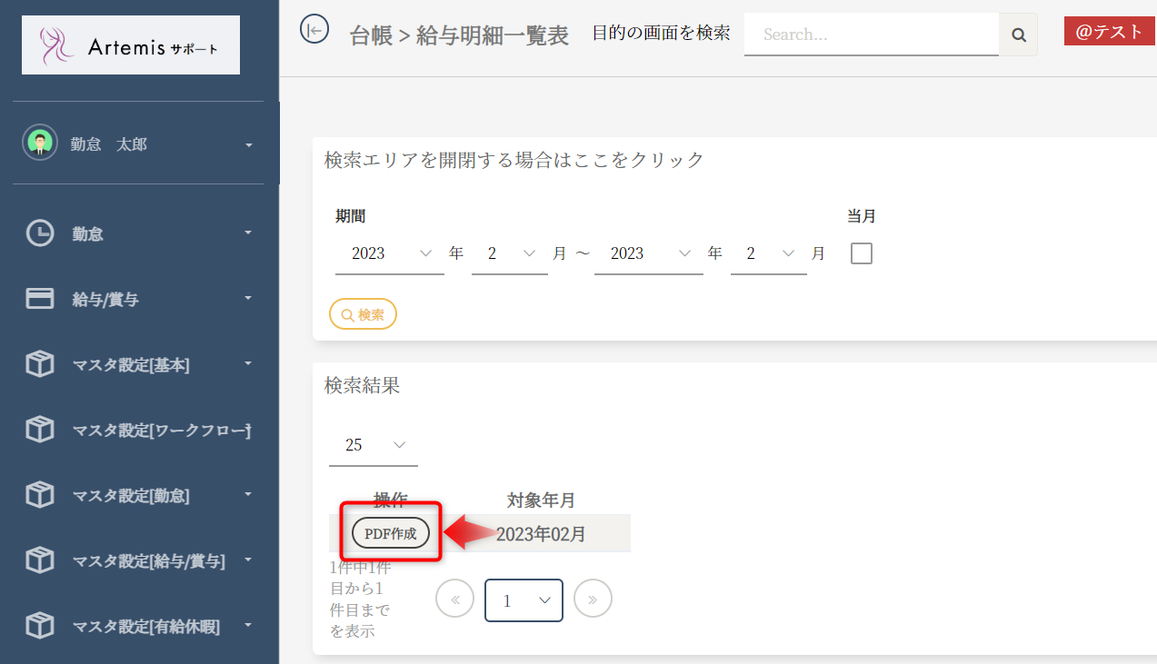 該当の従業員の「PDF作成」ボタンを押してください。