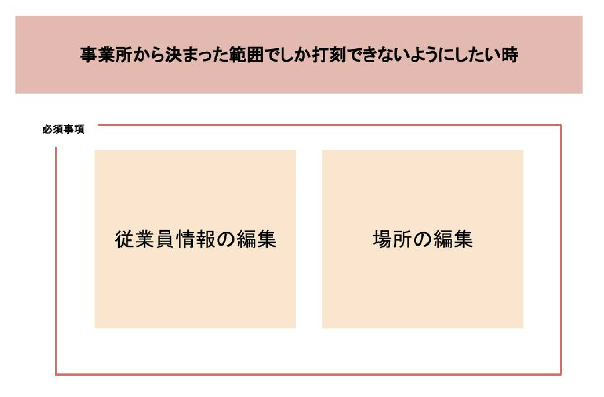 従業員が打刻をする時に事業所(店舗)から決まった範囲でしか打刻できないようにしたい場合には、「場所の編集」「従業員情報の編集」が必要となります。