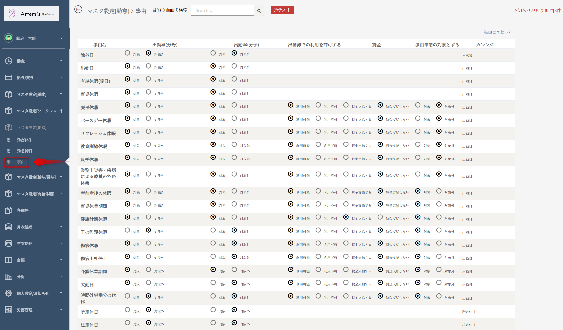 Artemisではたくさんの事由が申請できるようにデフォルトで用意させていただいております。ただ、ご利用中のお客様の中で必要のない事由に関しては事由申請画面から消す(表示しない)ようにすることが可能です。