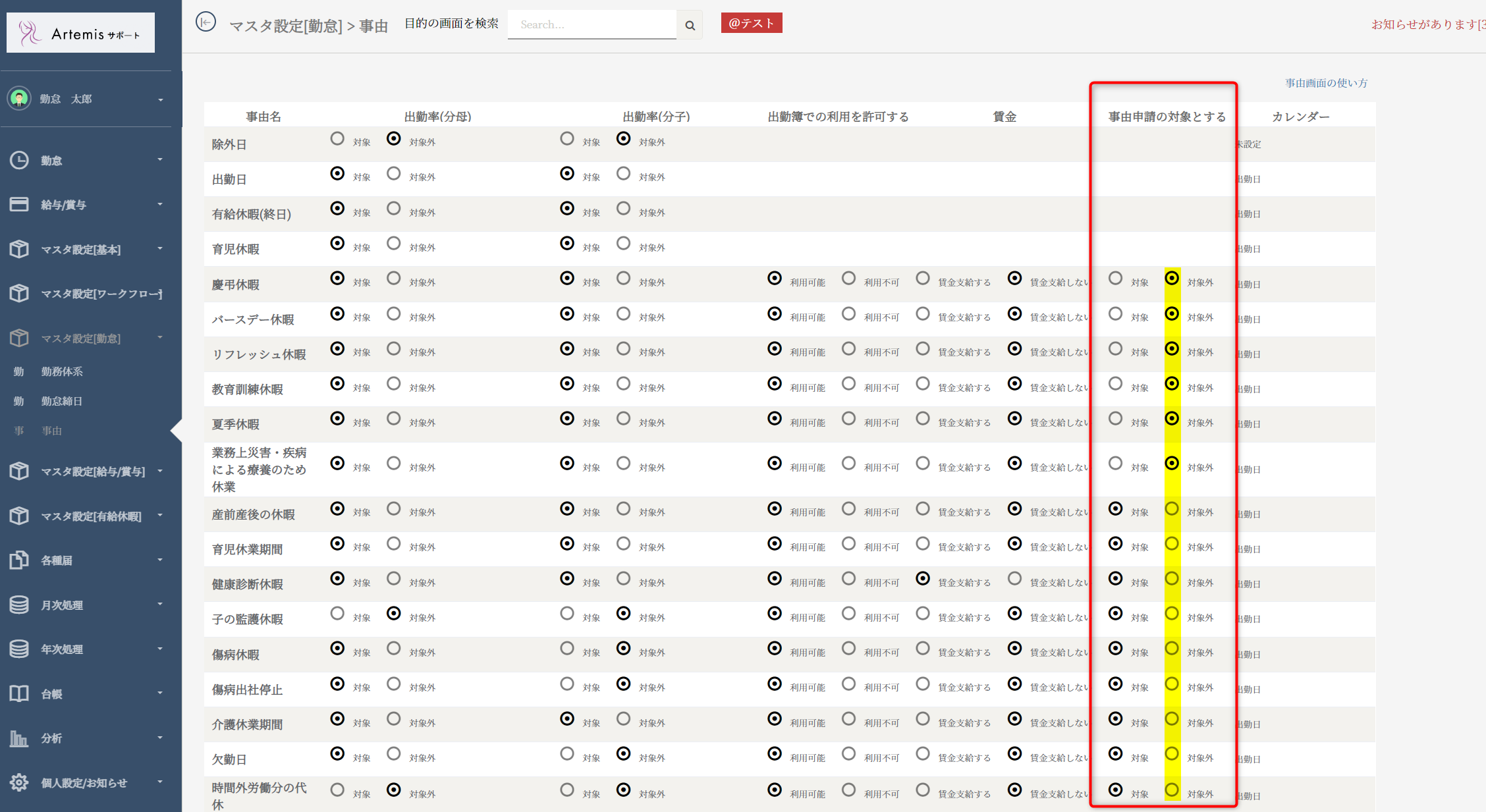 「事由申請の対象とする」欄を「対象外」にすると事由申請から消す(非表示)ことができます。
