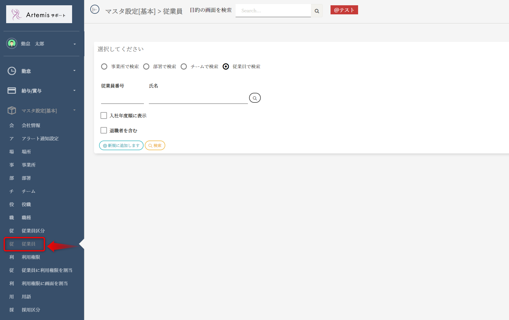 メニュー欄(左側)のマスタ設定(基本)>従業員ボタンを押してください。
