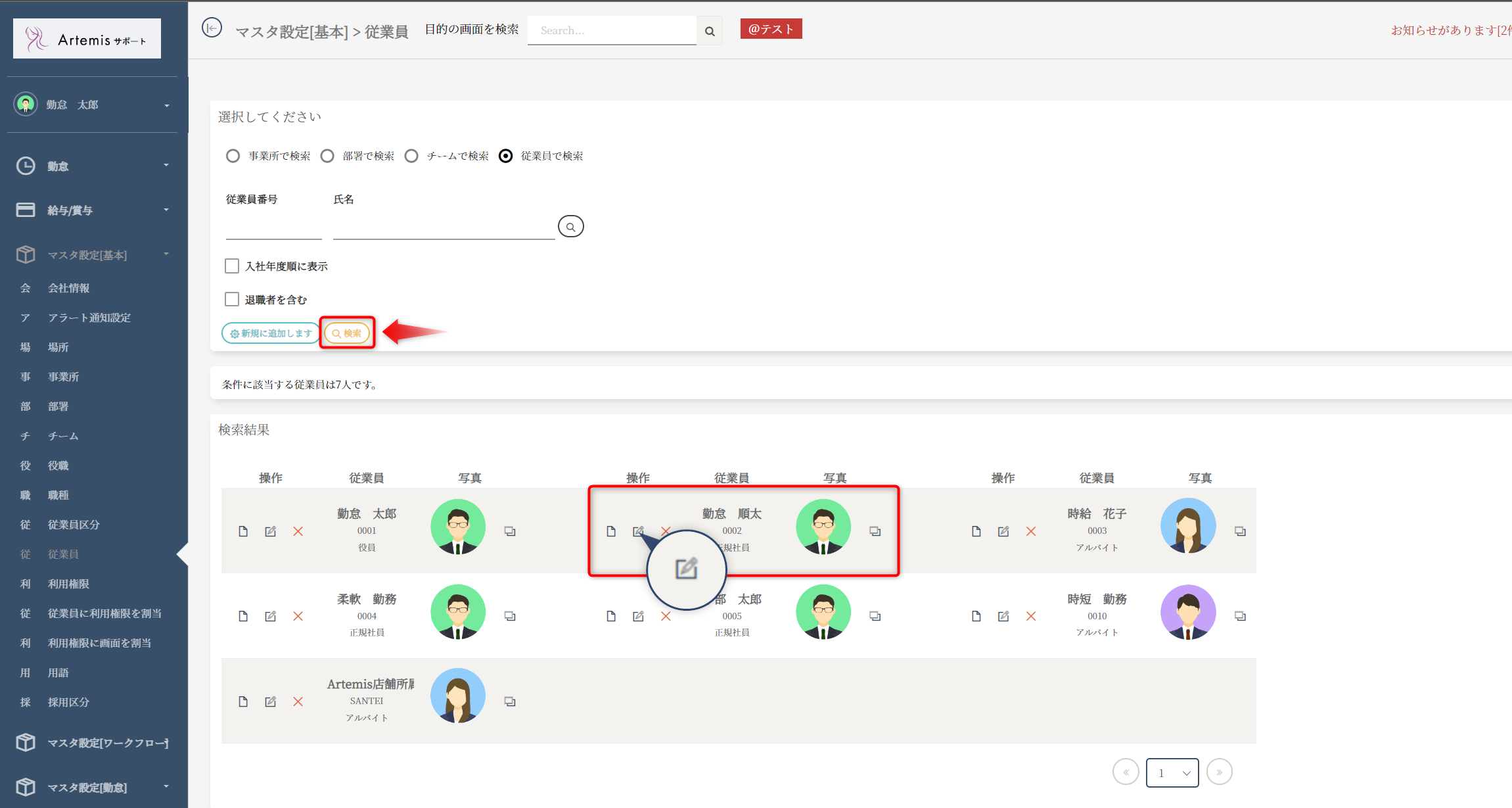 「検索」ボタンを押すと従業員の一覧が表示されます。