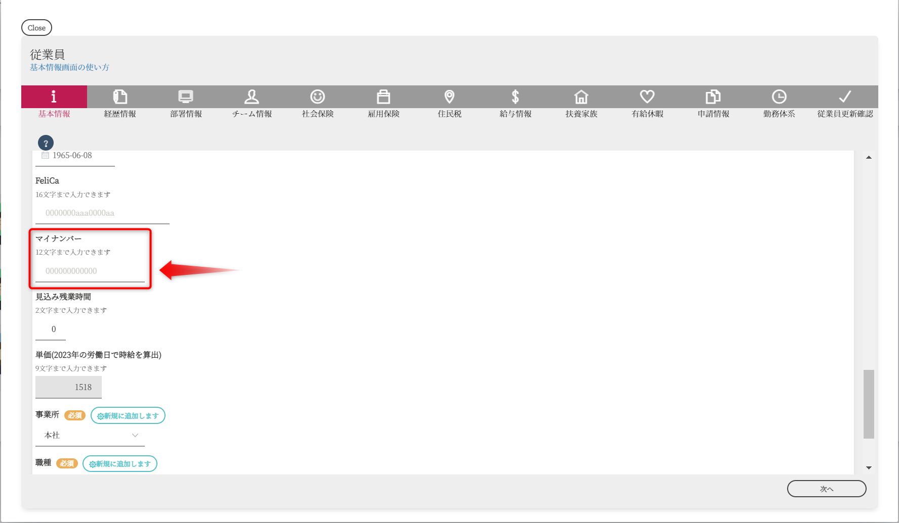 基本情報画面の「マイナンバー」欄に番号を入力してください。