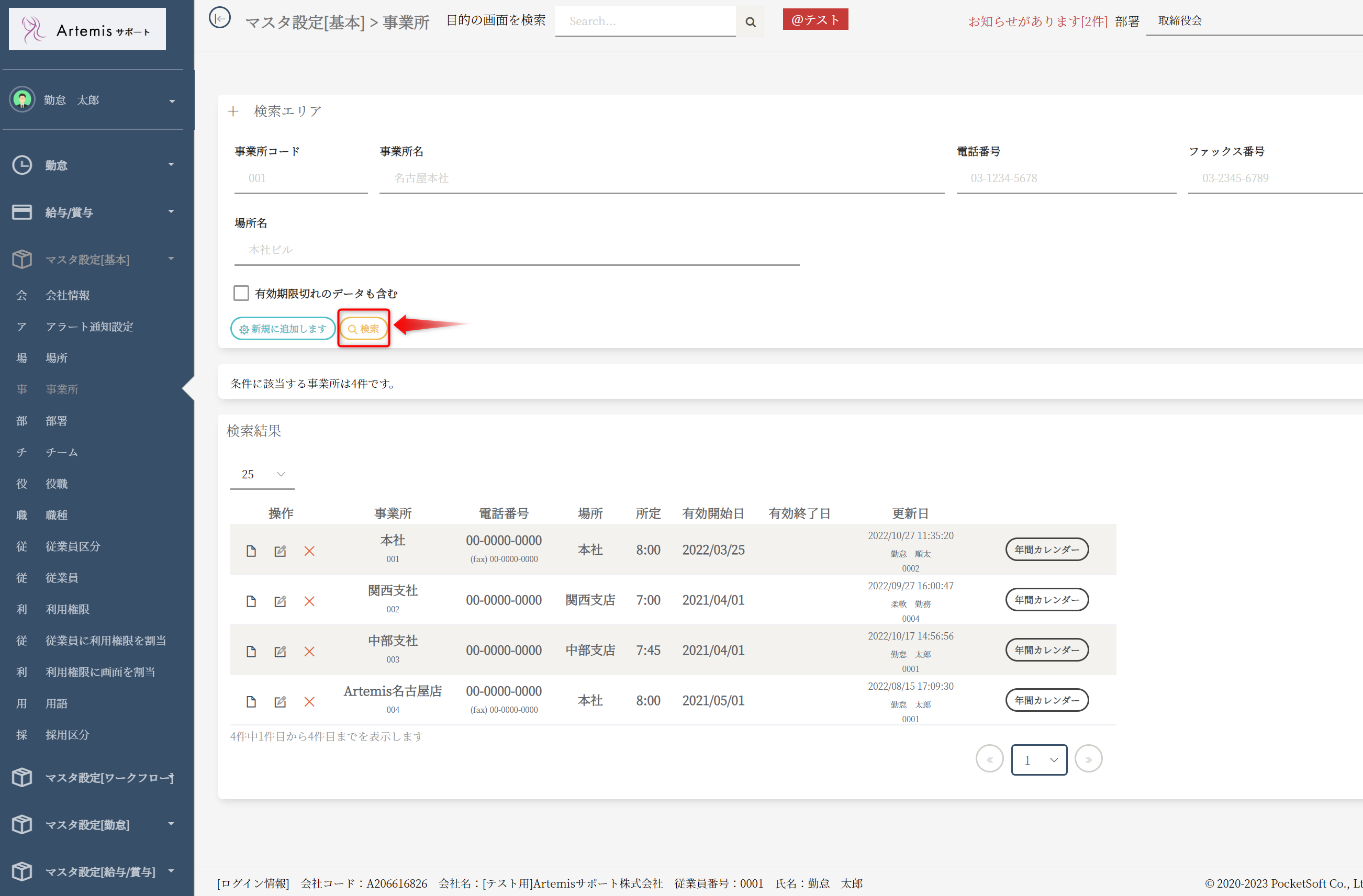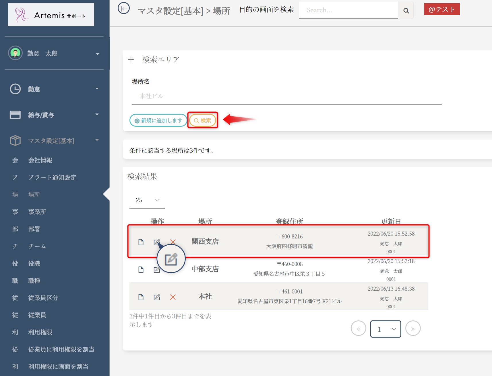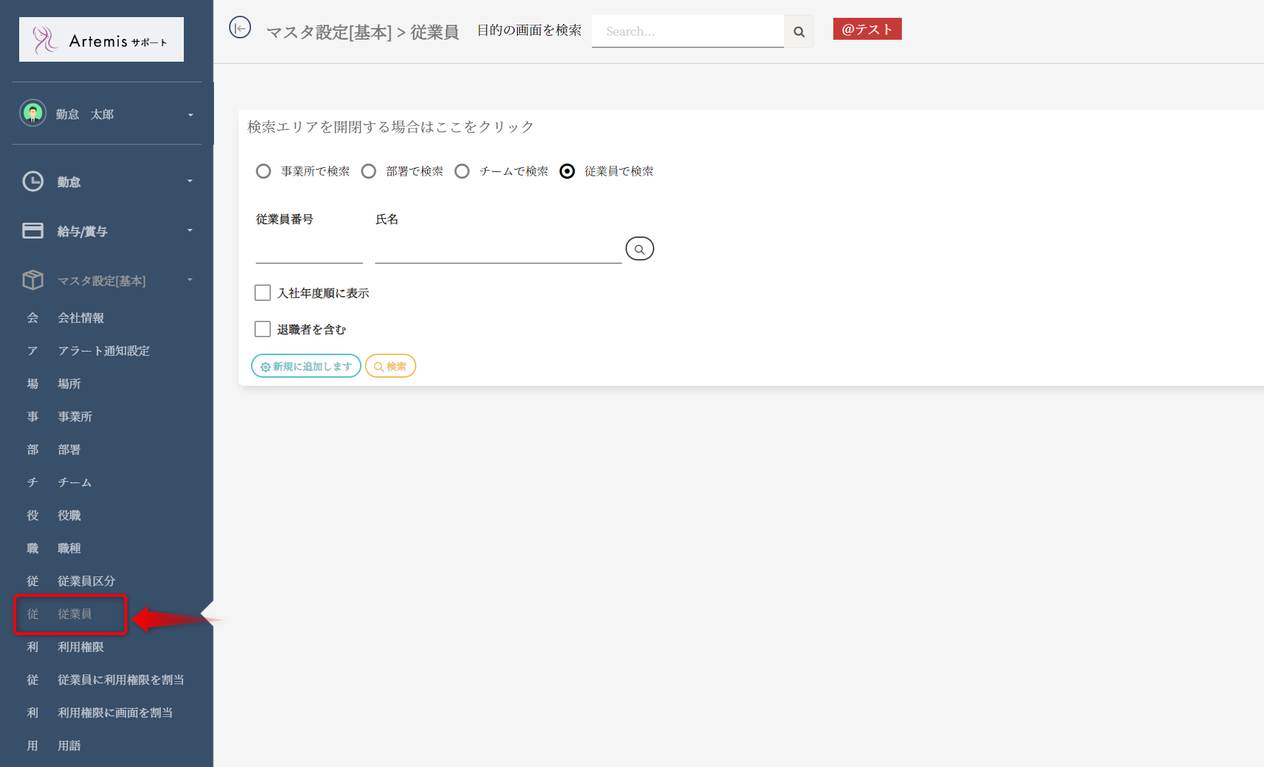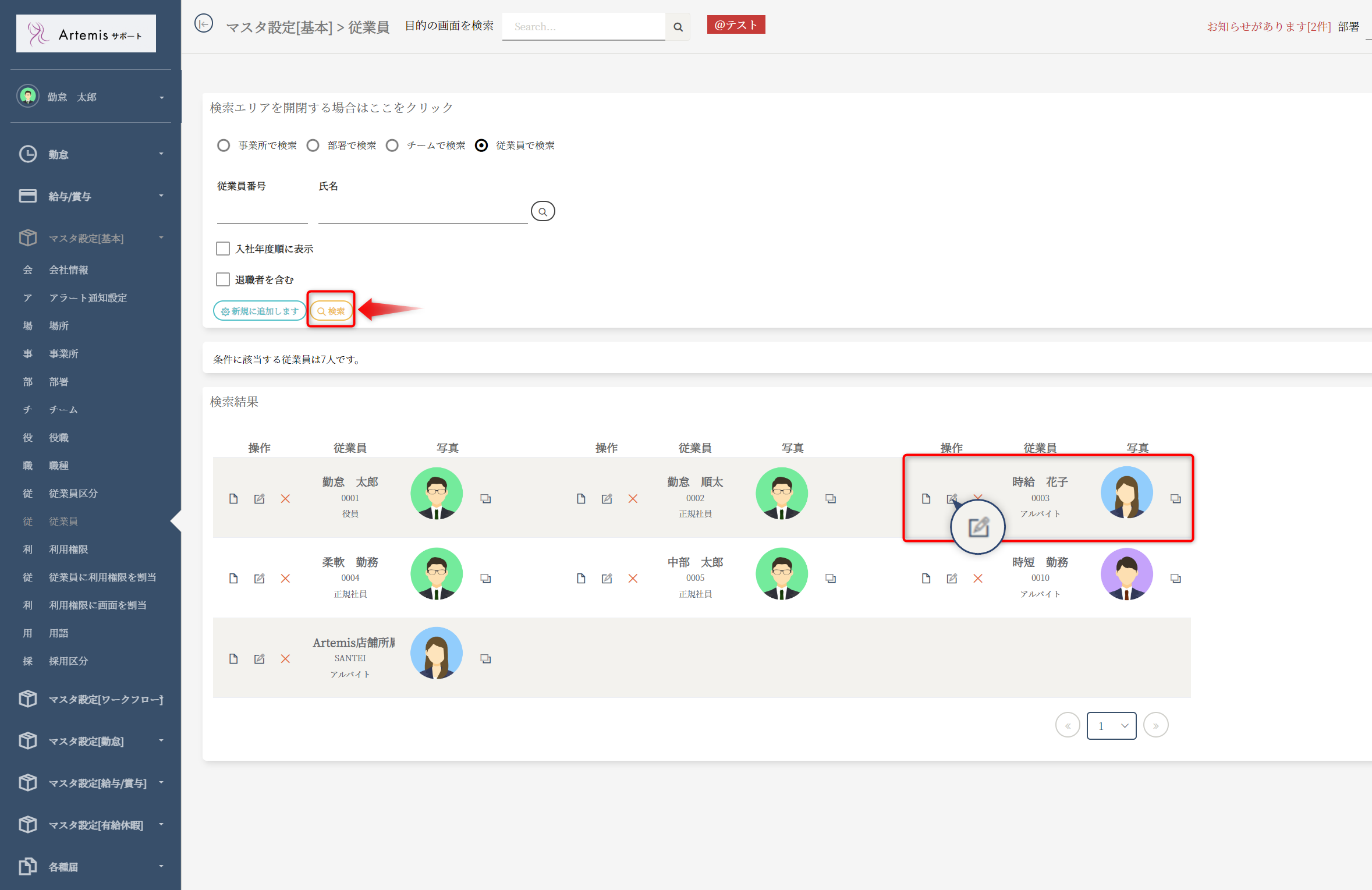 「検索」ボタンを選択し、従業員一覧を表示します。