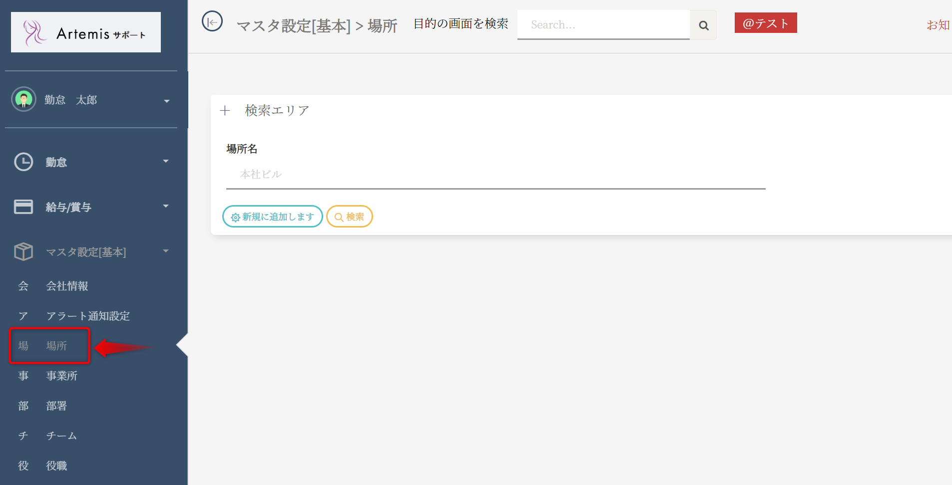メニュー欄(左側)のマスタ設定(基本)>場所ボタンを押してください。