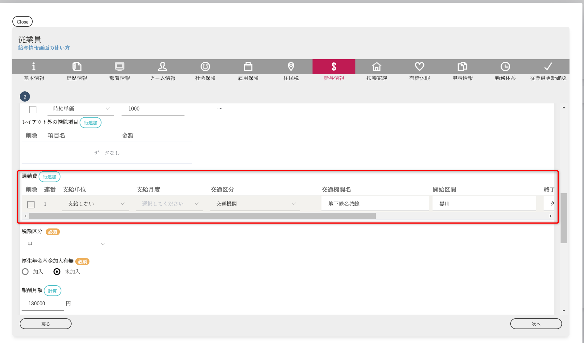 給与情報画面の通勤費欄を編集してください。