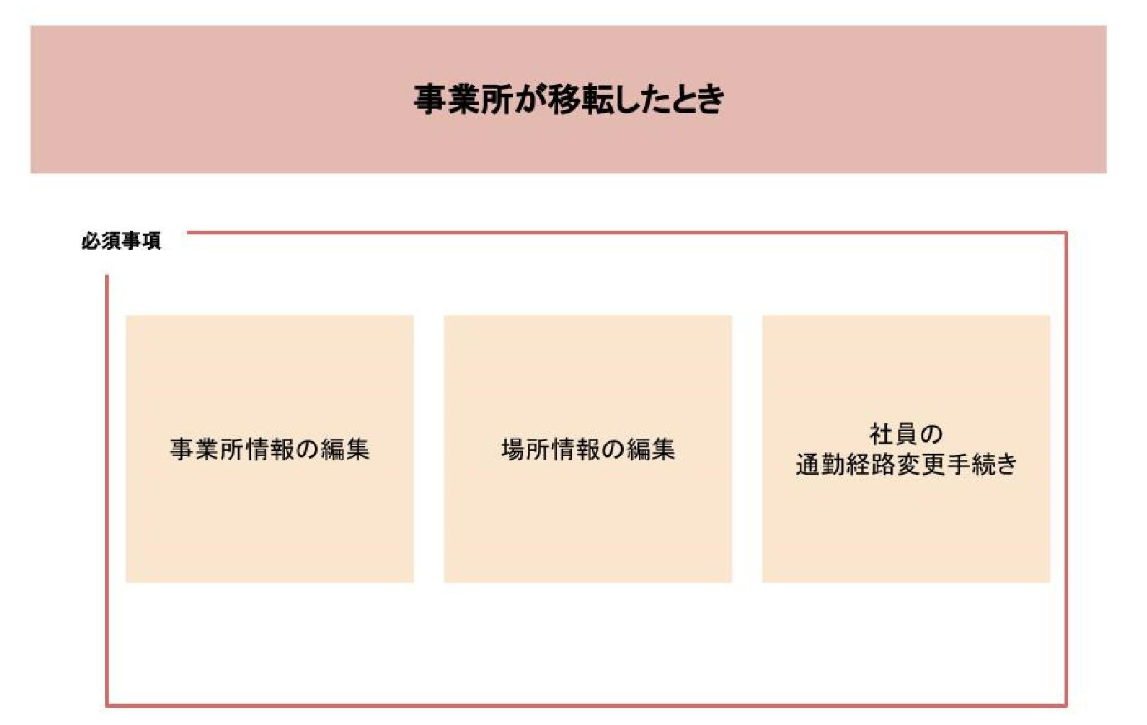 事業所が移転したときには「事業所情報の編集」「場所情報の編集」「社員の通勤経路変更手続き」が必要になります。