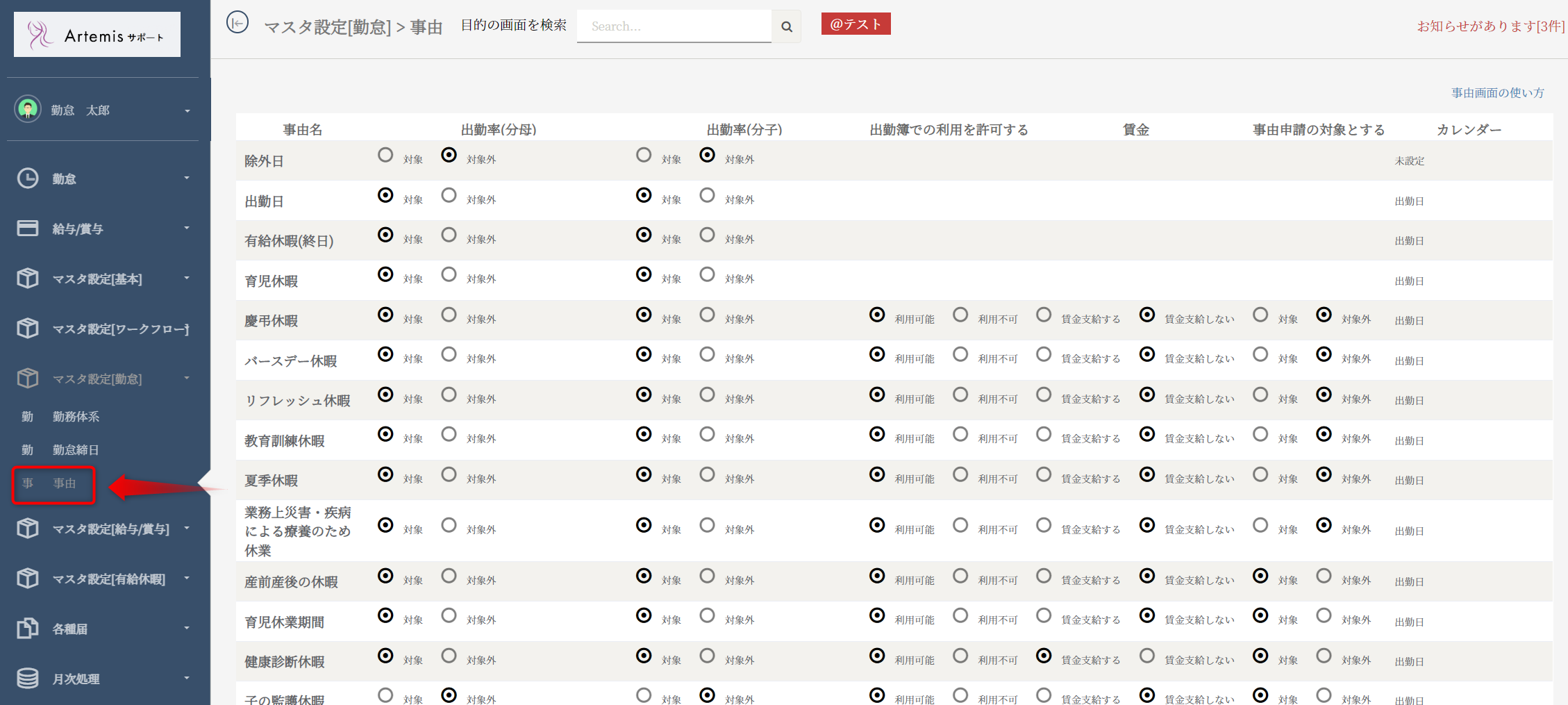 メニュー欄(左側)のマスタ設定(勤怠)>事由ボタンを押してください。