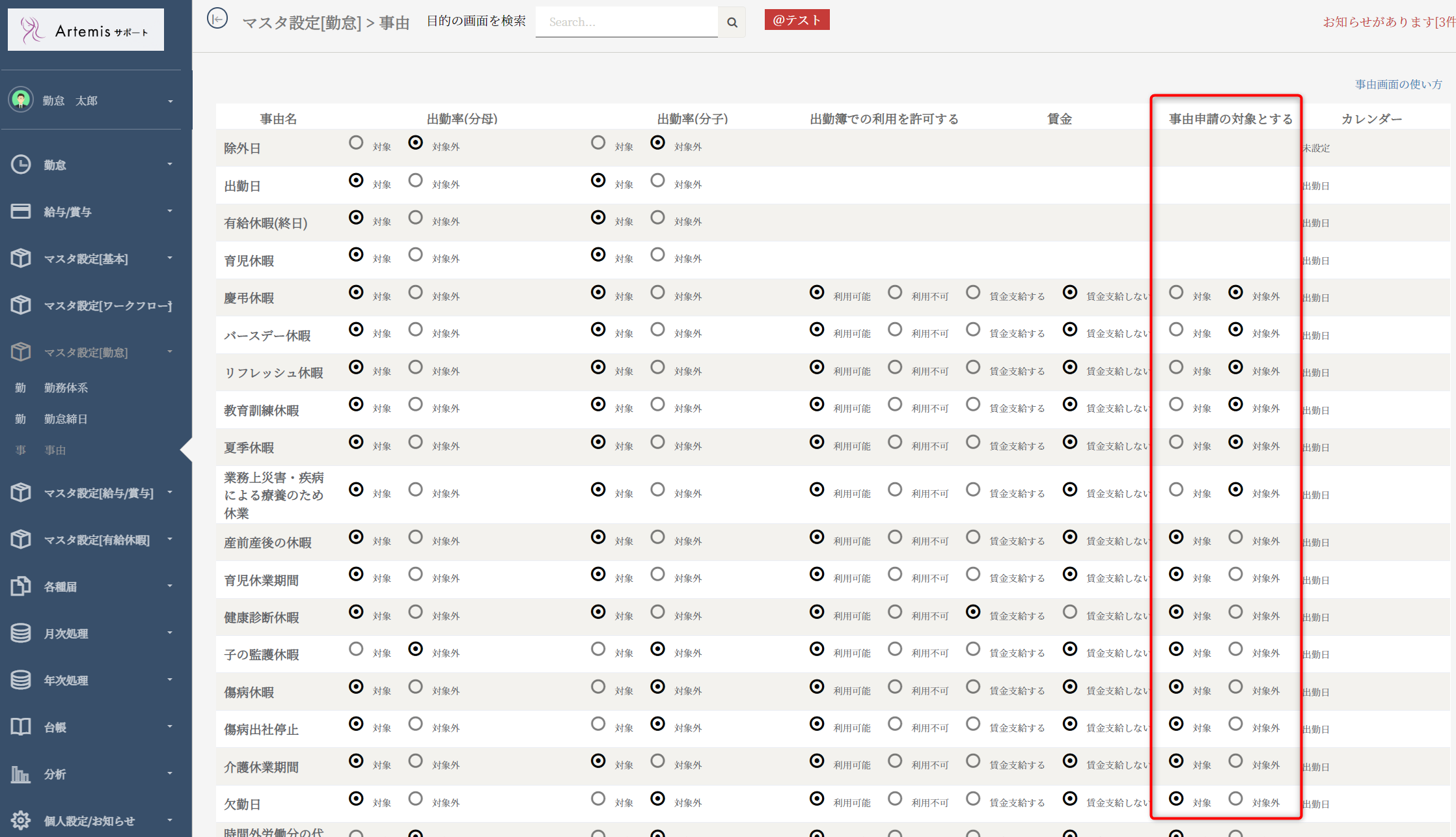 「事由申請の対象とする」欄をご覧ください。