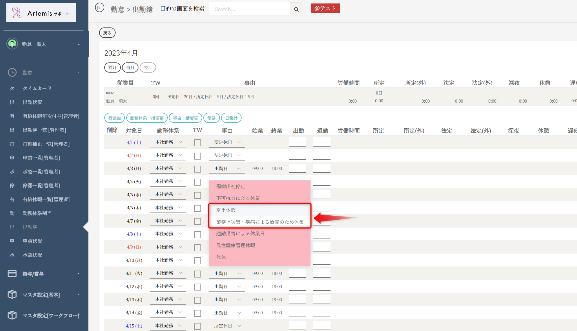 選択肢、「更新」ボタンを選択すると出勤簿に反映されます。