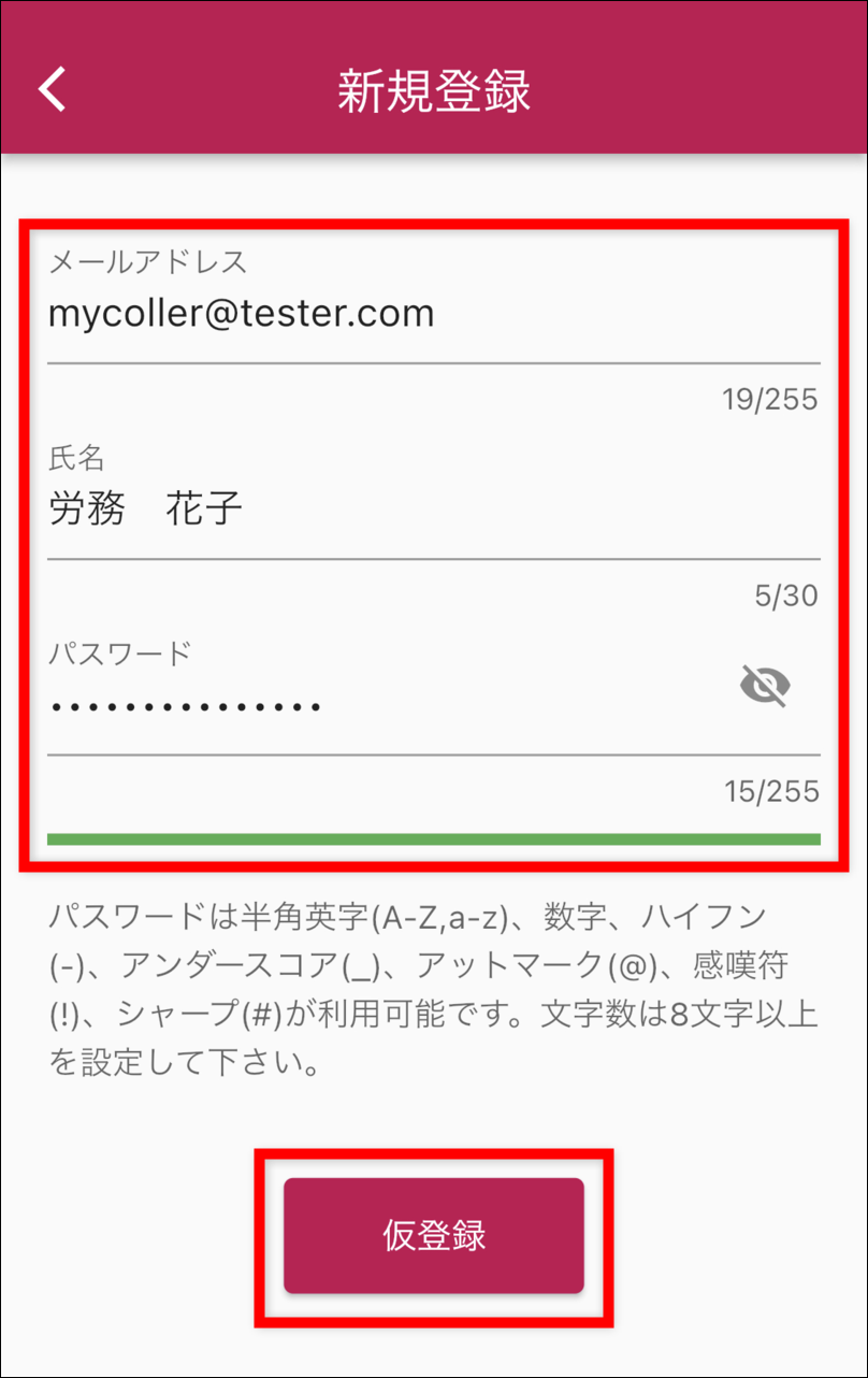 登録するメールアドレス、氏名、任意のパスワードを入力して、「仮登録」をタップします。