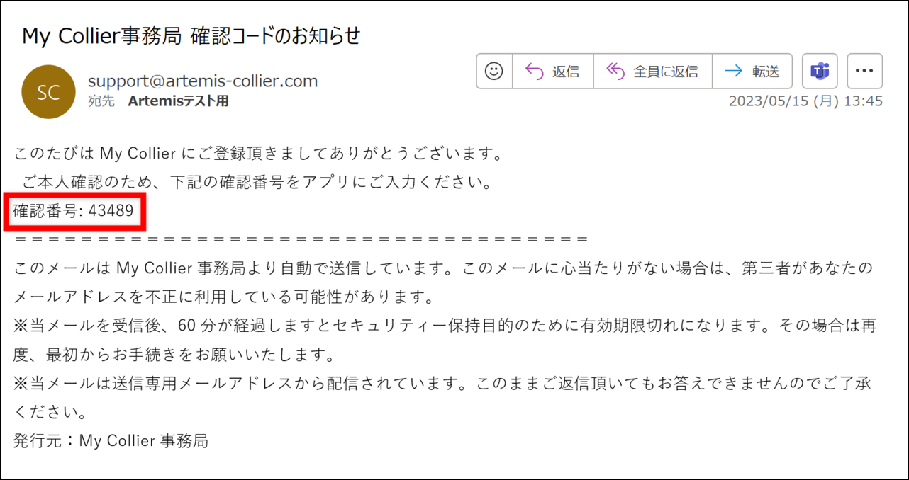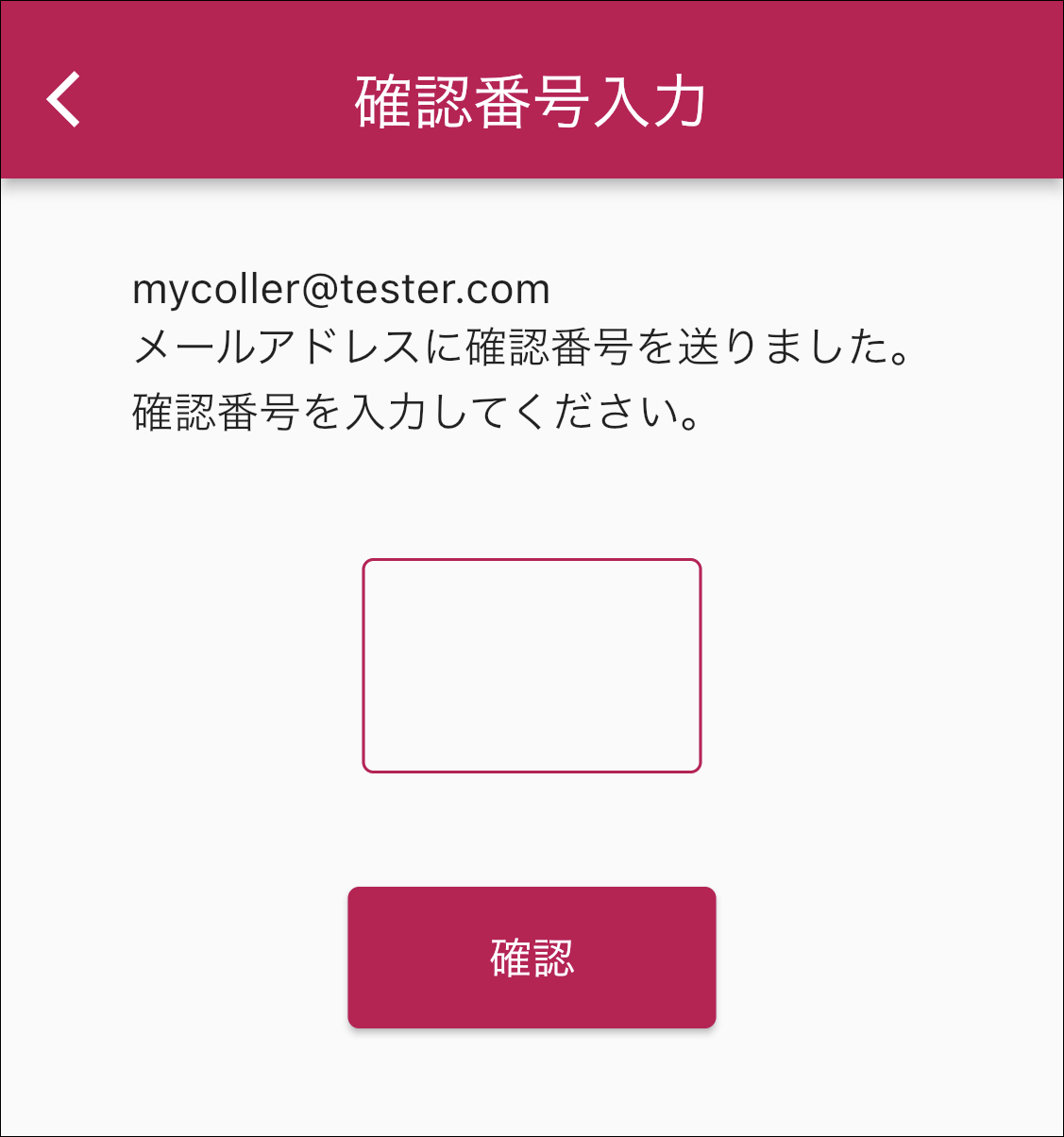 MyCollierのアプリを開いて、メールで届いた確認番号を入力します。