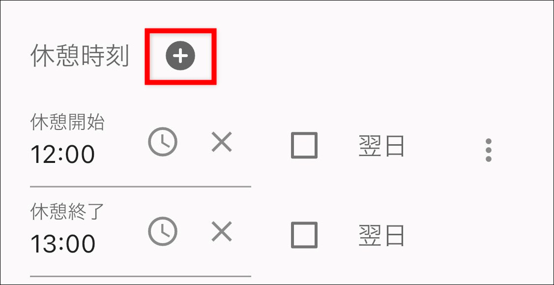 「+」をタップすると、入力ボックスが追加されます。 休憩時間が決まっている場合は、その時間を入力します。(複数追加することができます) |