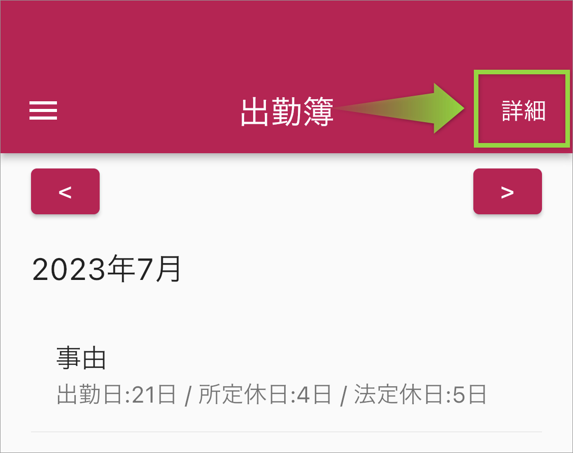 2.その月の日毎の勤怠情報を確認するには「詳細」をタップします。