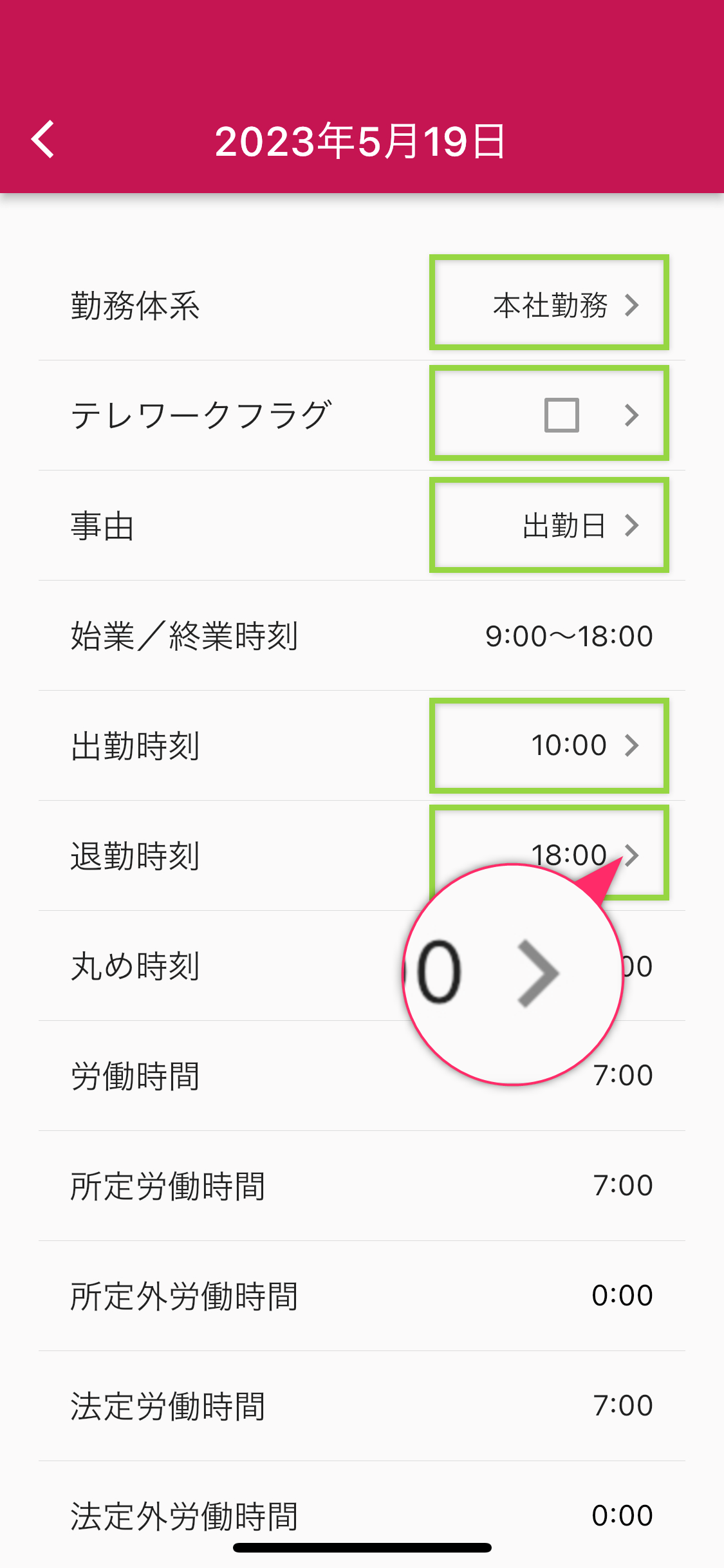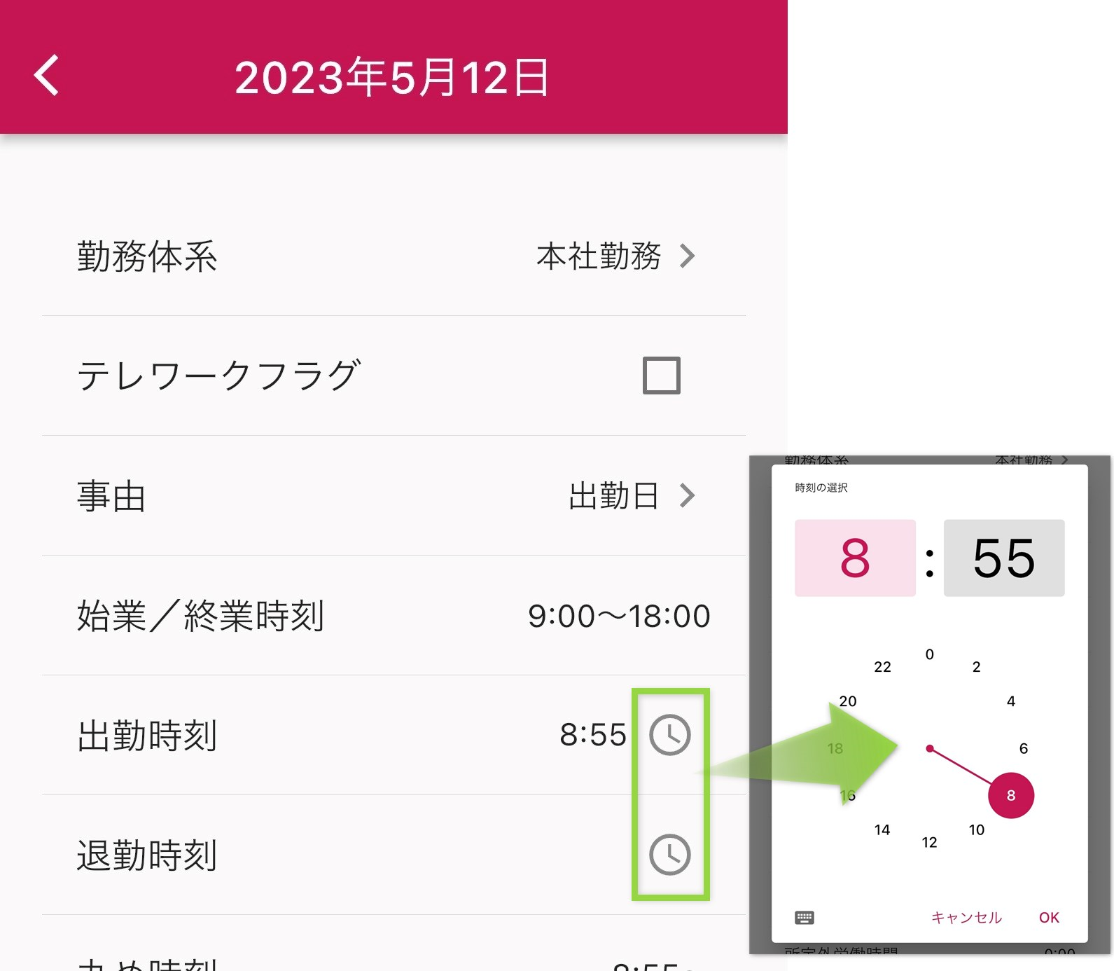- 対象日詳細画面で、出勤時刻・退勤時刻を入力する。