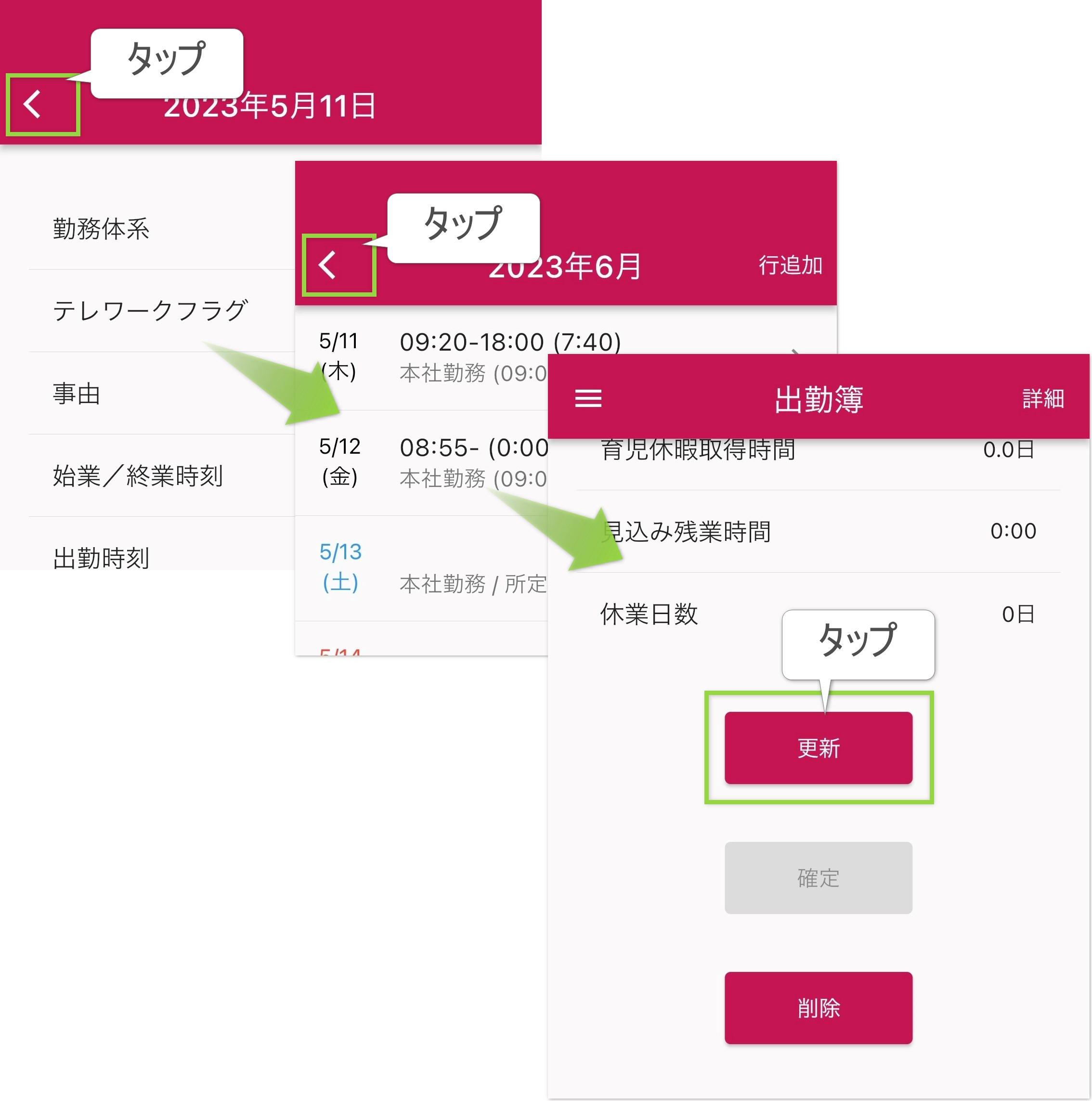 - 更新は、出勤簿の最初の画面まで戻って「更新」をタップしてください。