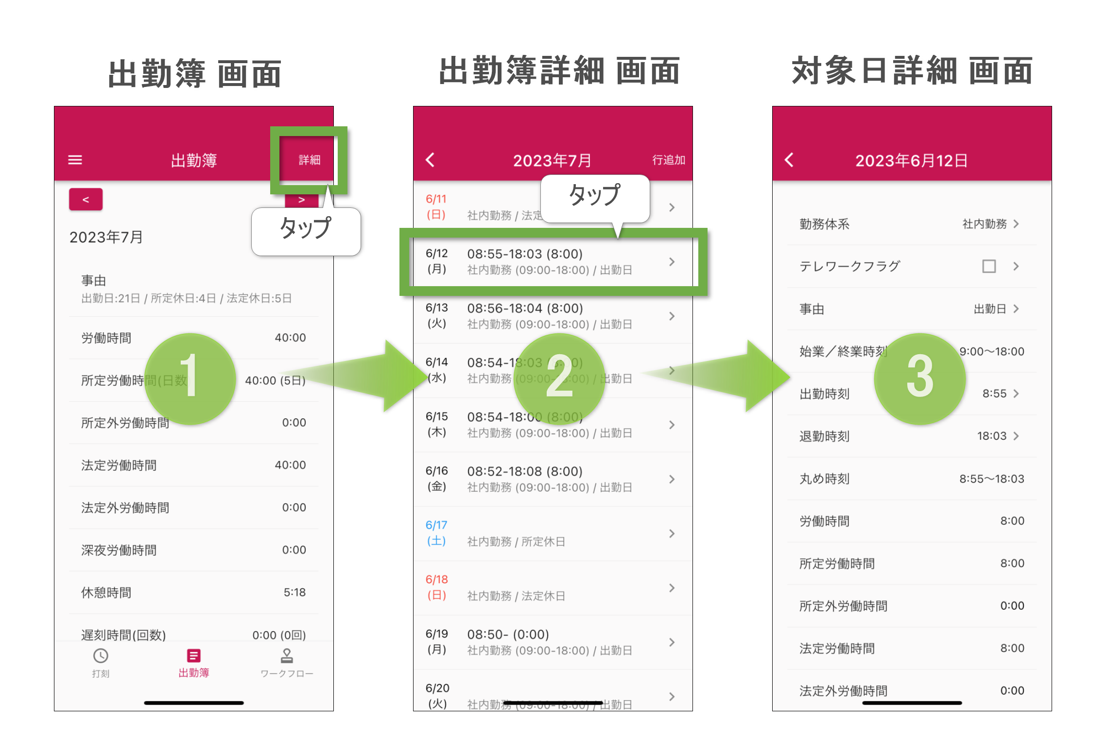 日ごとの出勤・退勤時刻・労働時間等が表示されます。「詳細画面」と呼びます。
