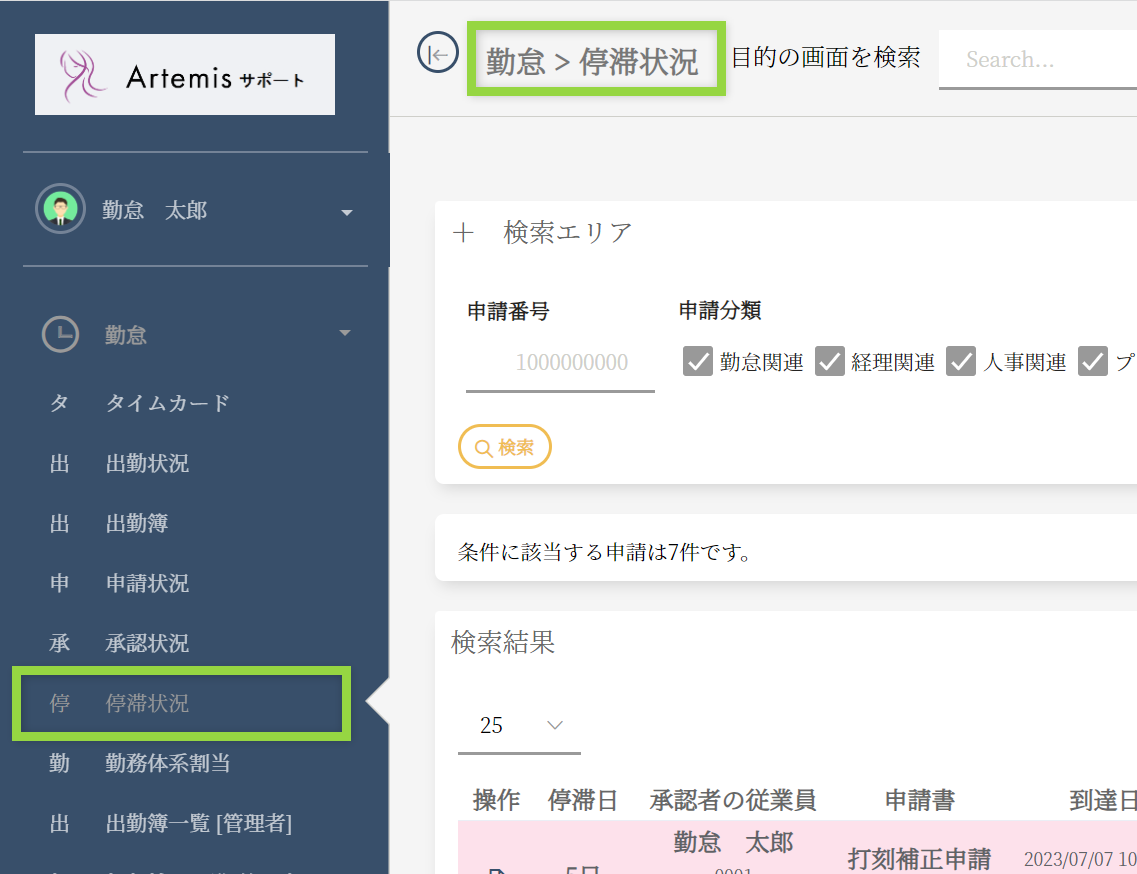 メニュー 勤怠>停滞一覧[管理者]の画面名を、変更しました。