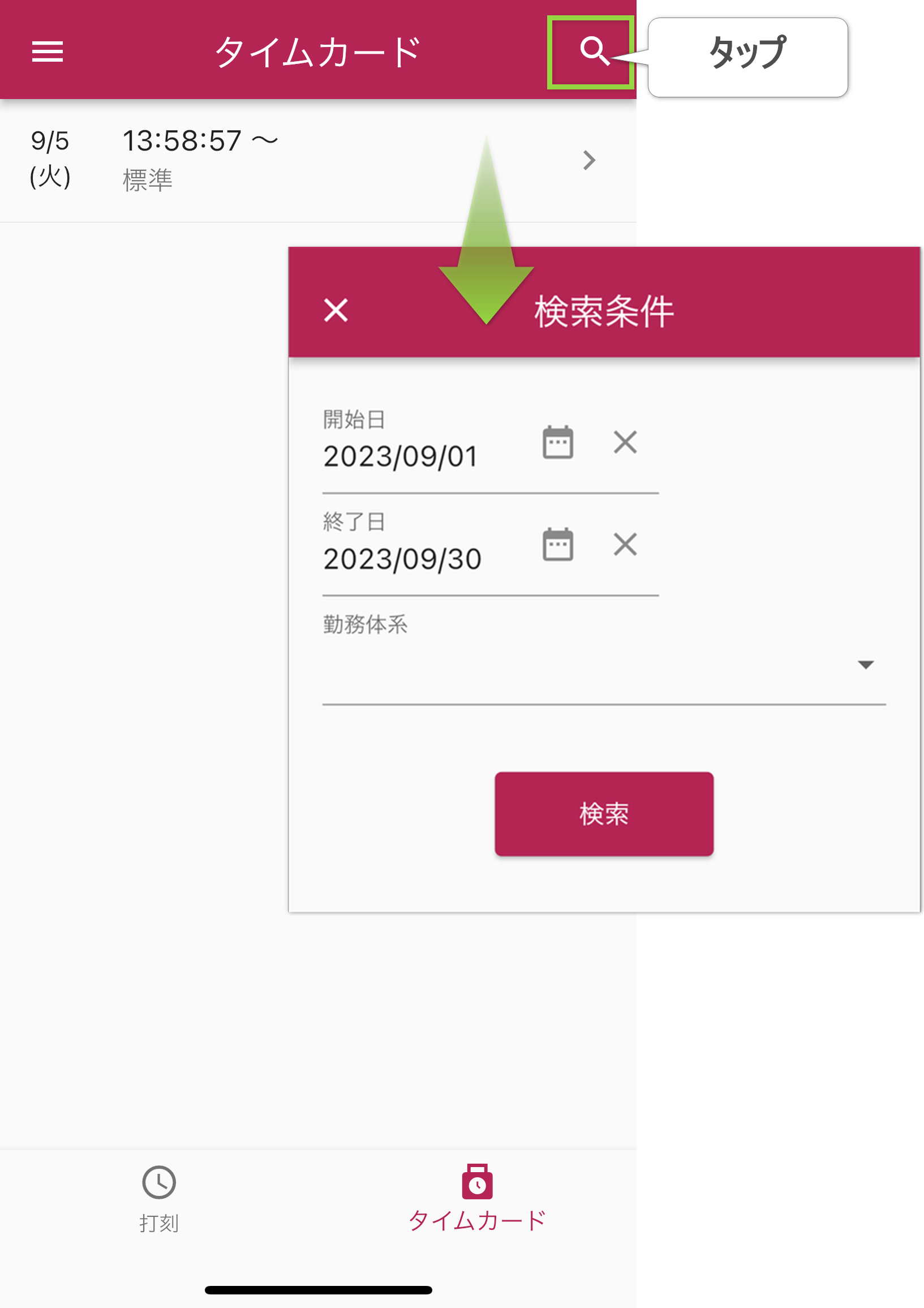 前月のタイムカードを確認する場合は、こちらの開始日-終了日を指定して検索しましょう。