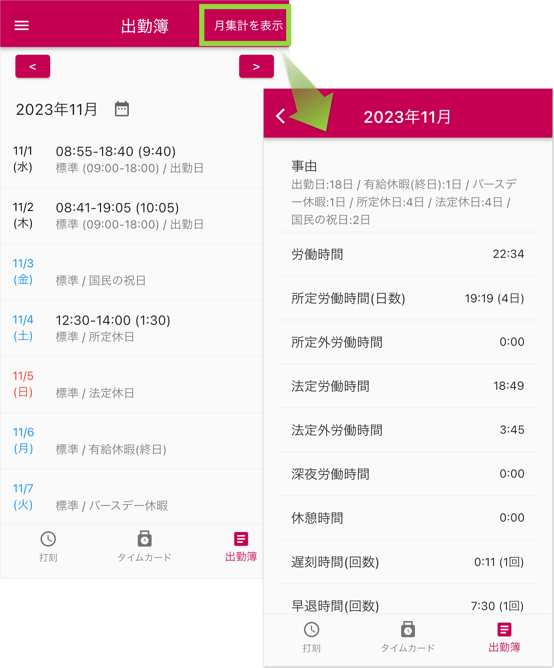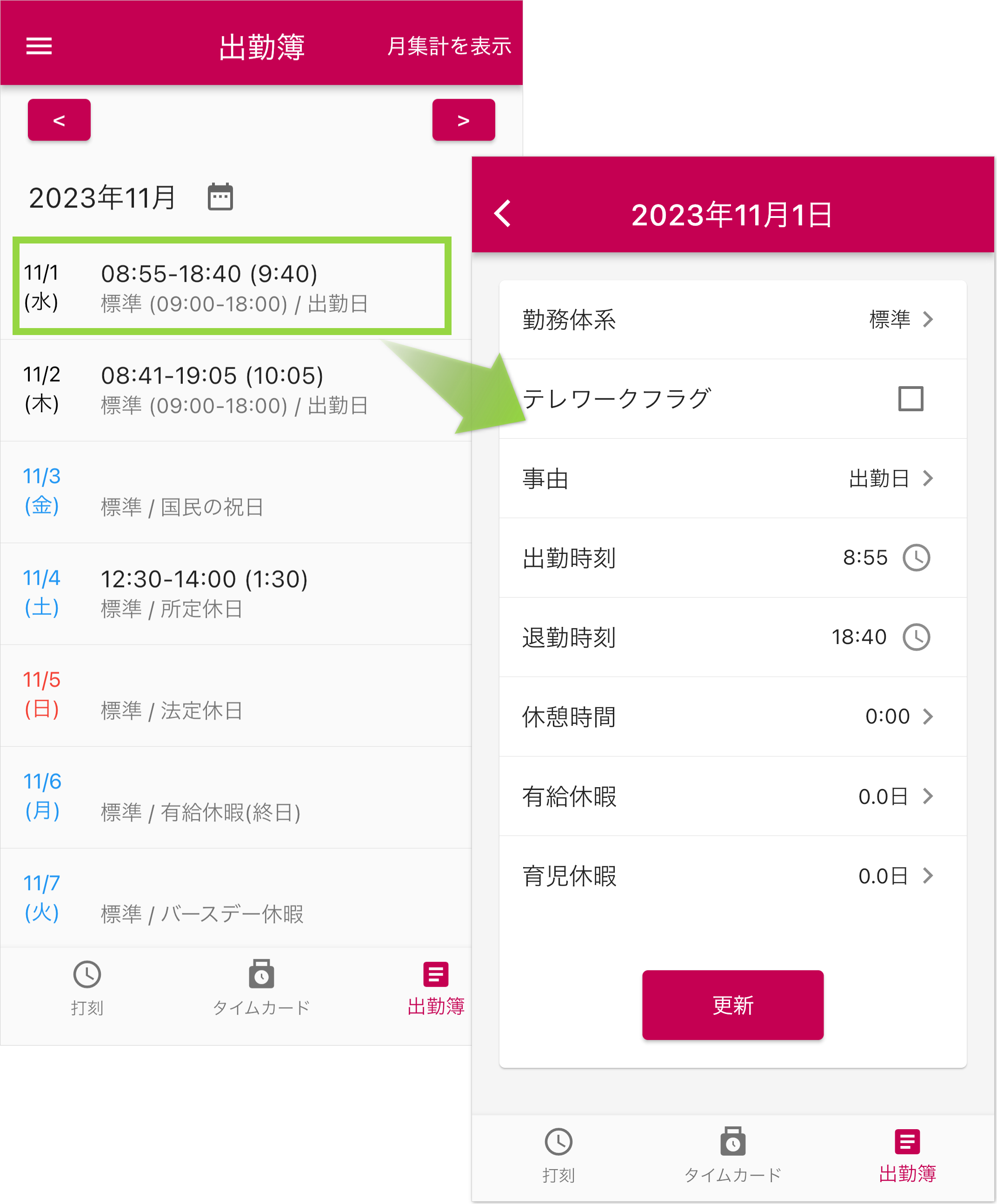 - 打刻した記録は、タイムカード画面で確認、出勤簿画面で確認・修正を行うことができます。