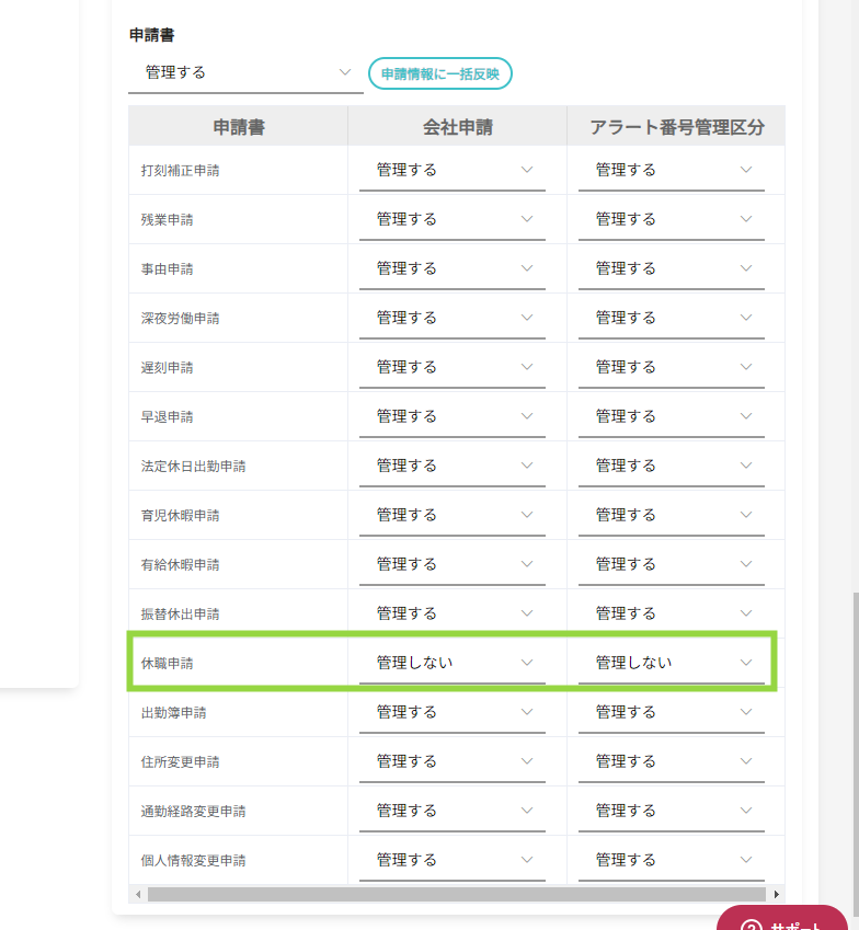 何も設定を変更していない場合、初期設定では休職申請「管理しない」に設定されております。