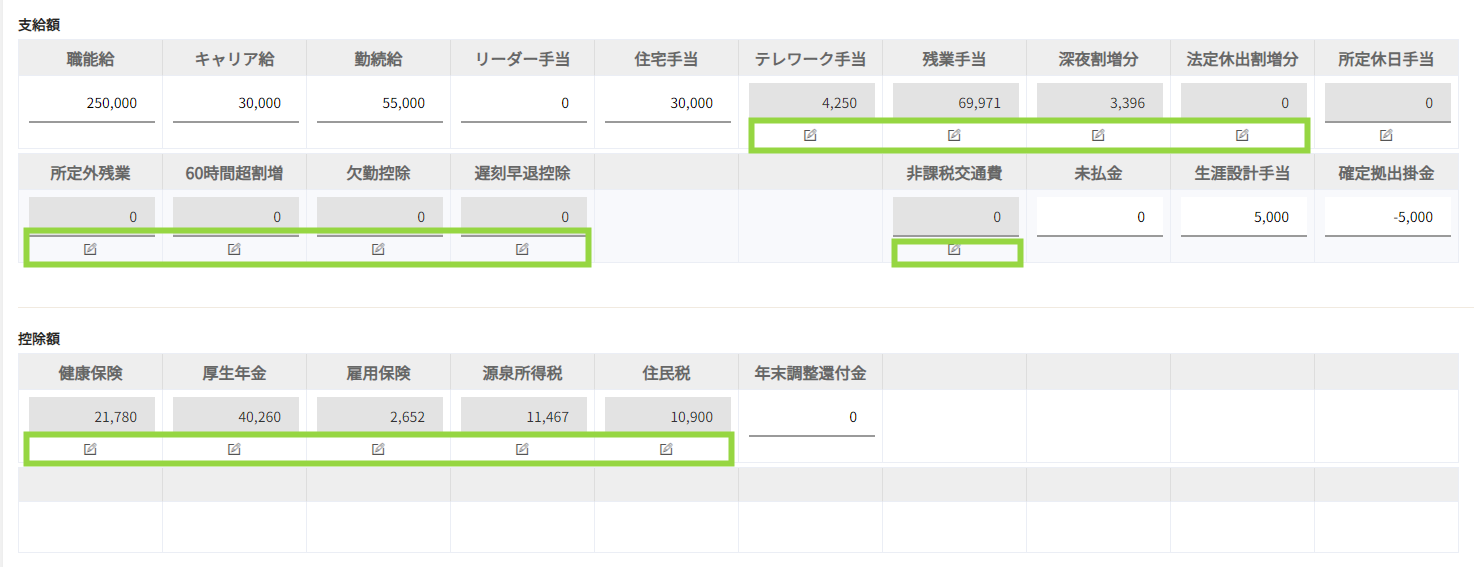 上記対象項目も、給与明細作成時に金額を変更できるようになりました。