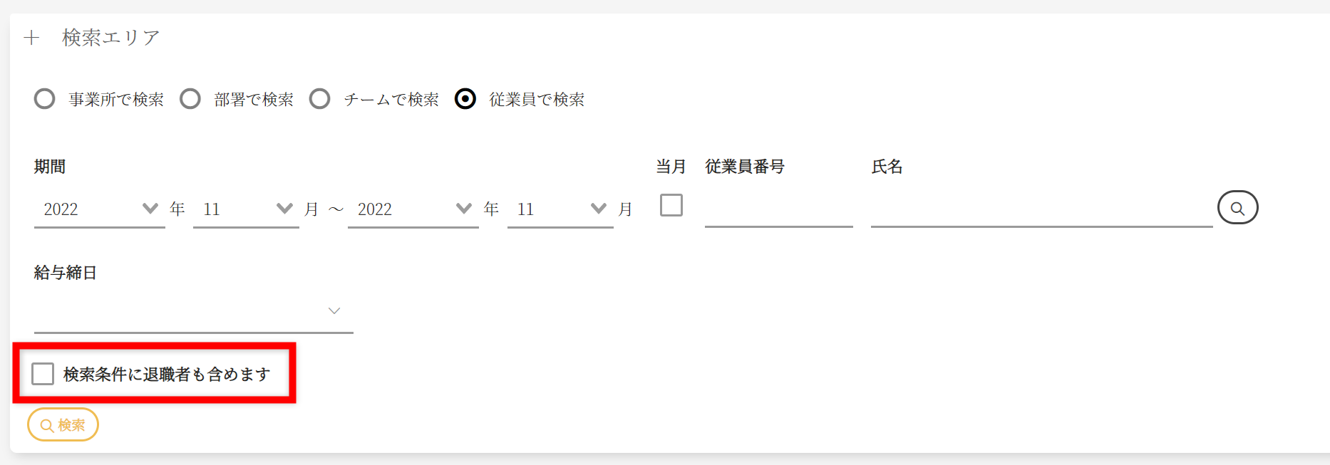退職後の従業員の給与明細書を作成するには、必ず「退職者を含めます」にチェックを入れて検索する必要があった。(初期はチェックが入っていない状態。賃金台帳の検索も同様)