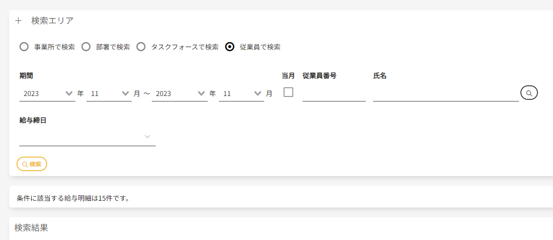 給与明細書の作成対象の従業員(退職者含む)は、検索エリアの入力条件からすべて検索結果に表示されます。