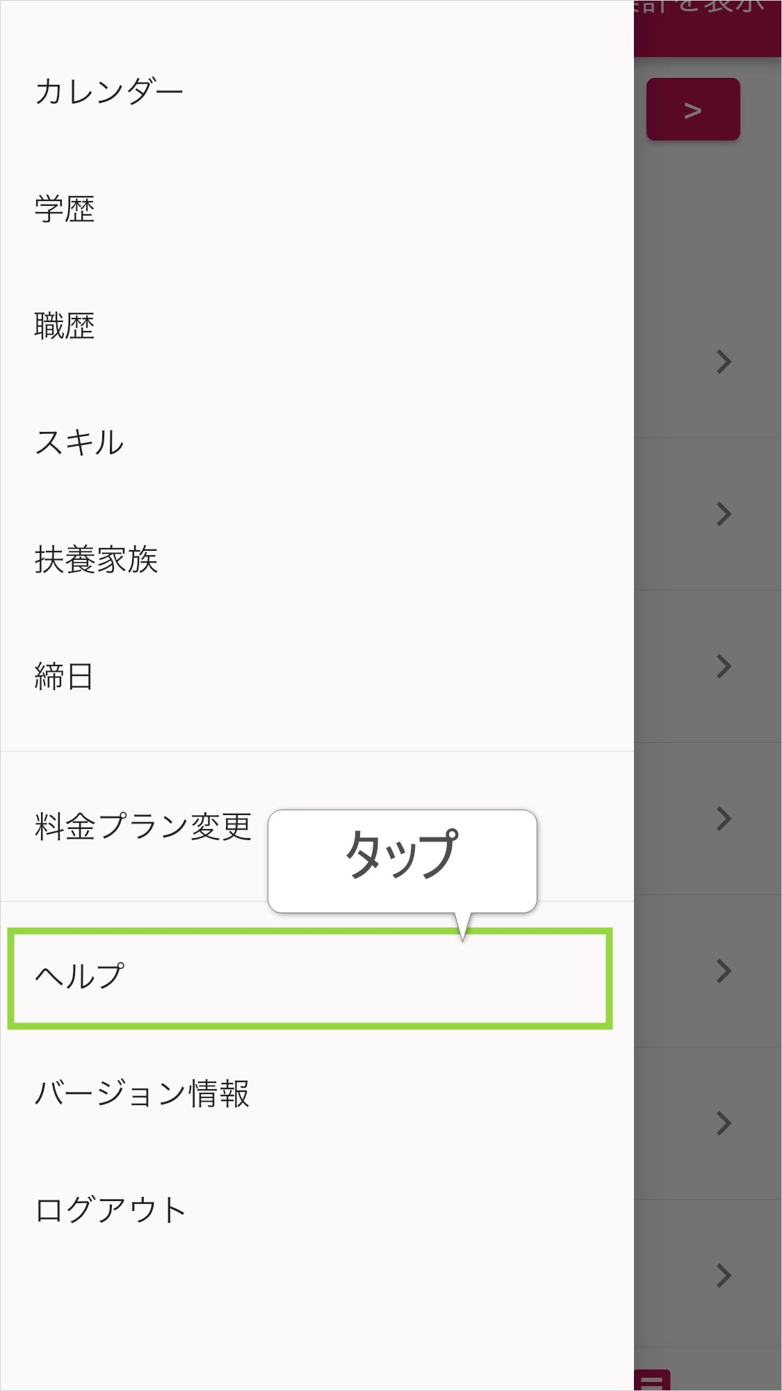 「ヘルプ」をタップして、ヘルプページ(Webサイト)を開きます。