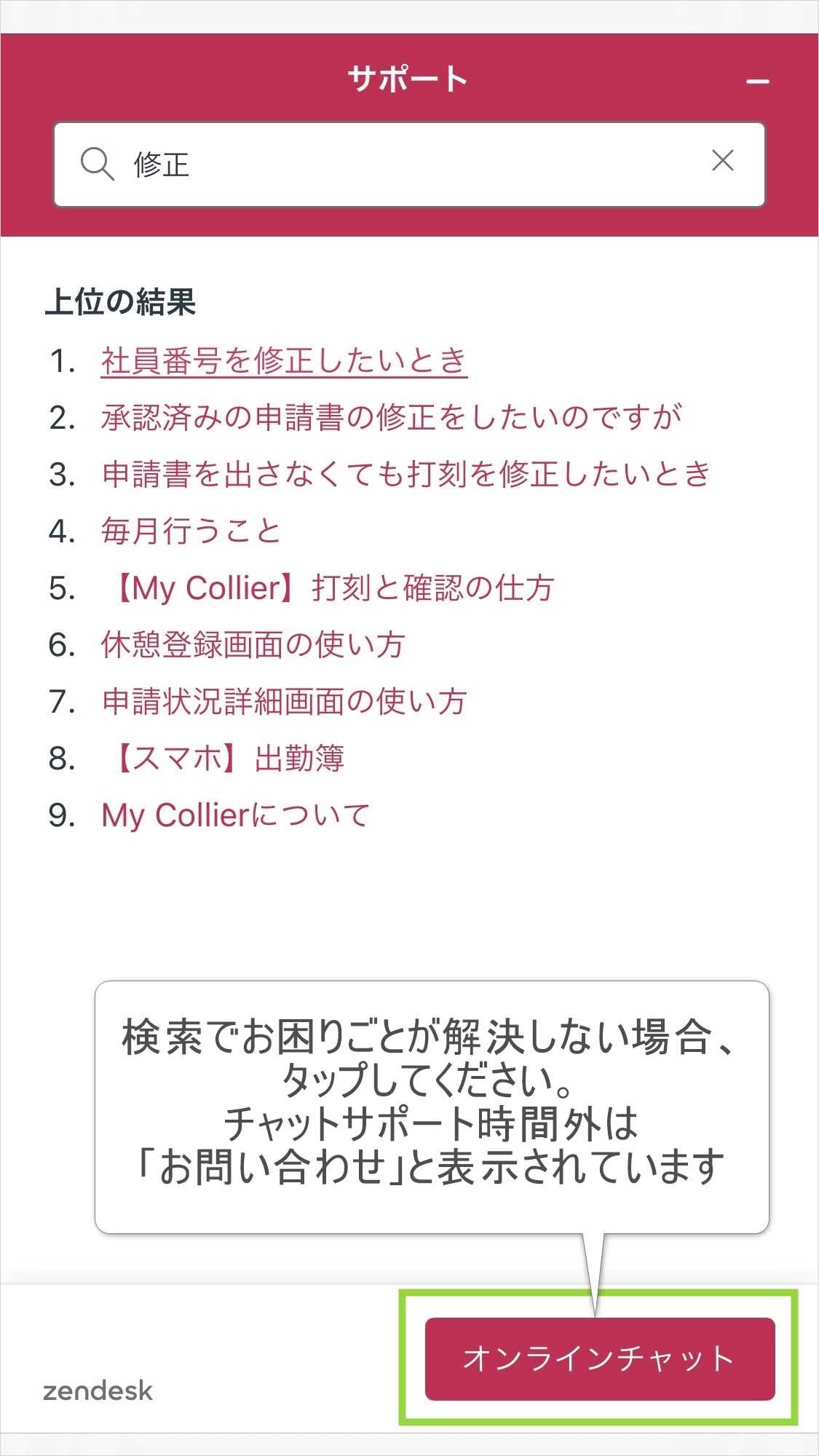 検索でお困りごとが解決しない場合、右下の「オンラインチャット」をタップします。