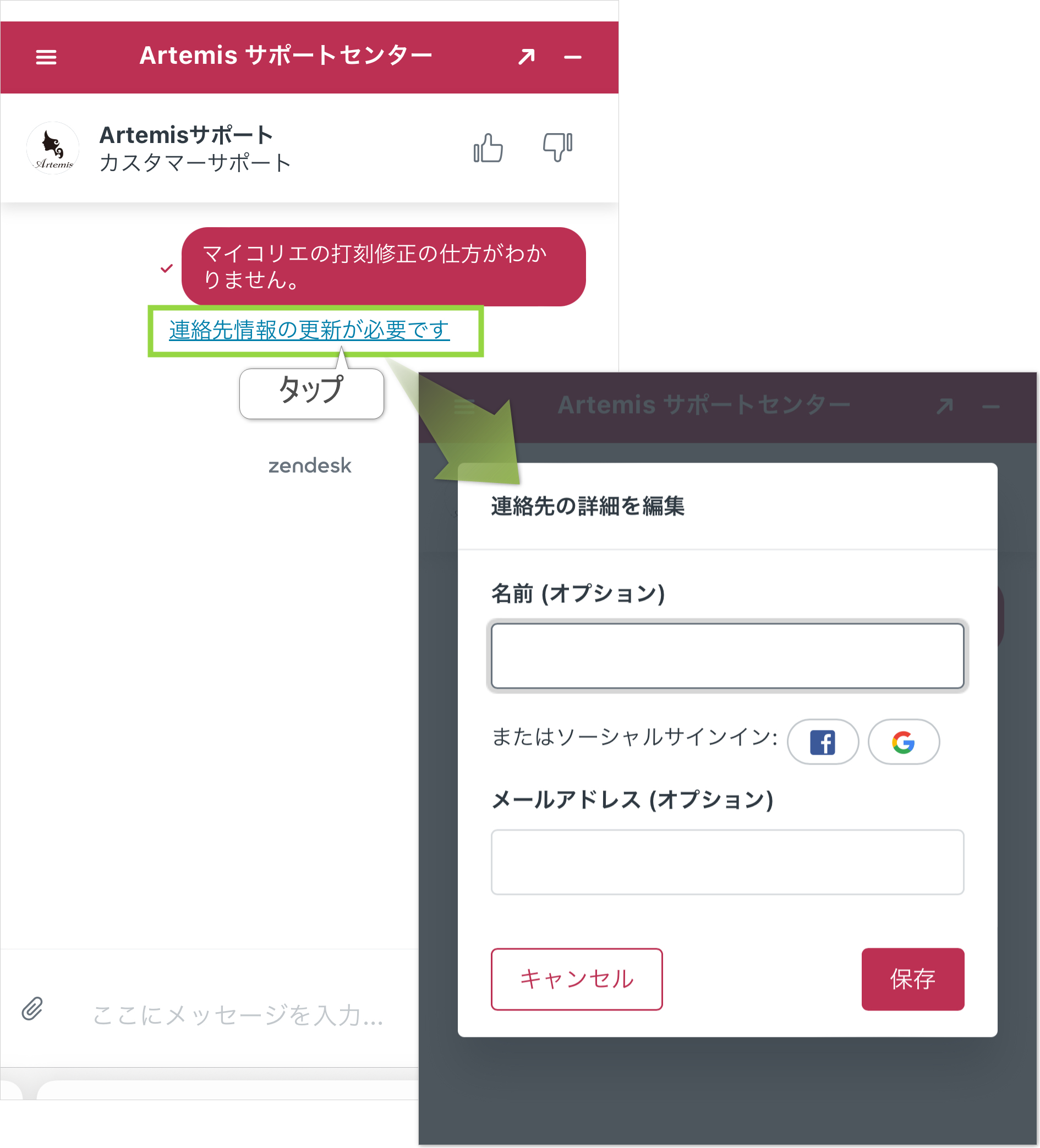 「連絡先情報の更新が必要です」もしくは右上の「≡」>「連絡先の詳細を編集」から、お名前・ご登録のメールアドレスの保存をお願いいたします。