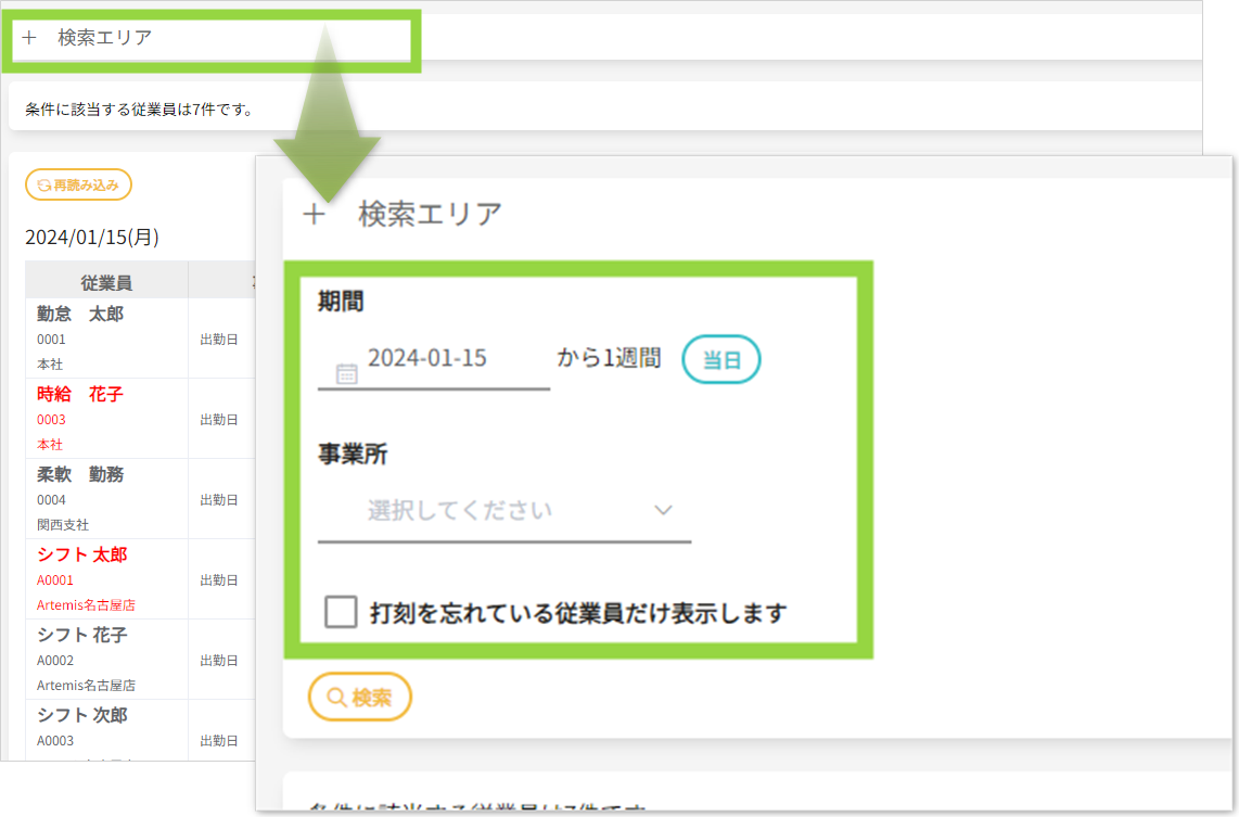 - 事業所の絞り込み、期間の変更は、「+検索エリア」から入力して検索してください。
